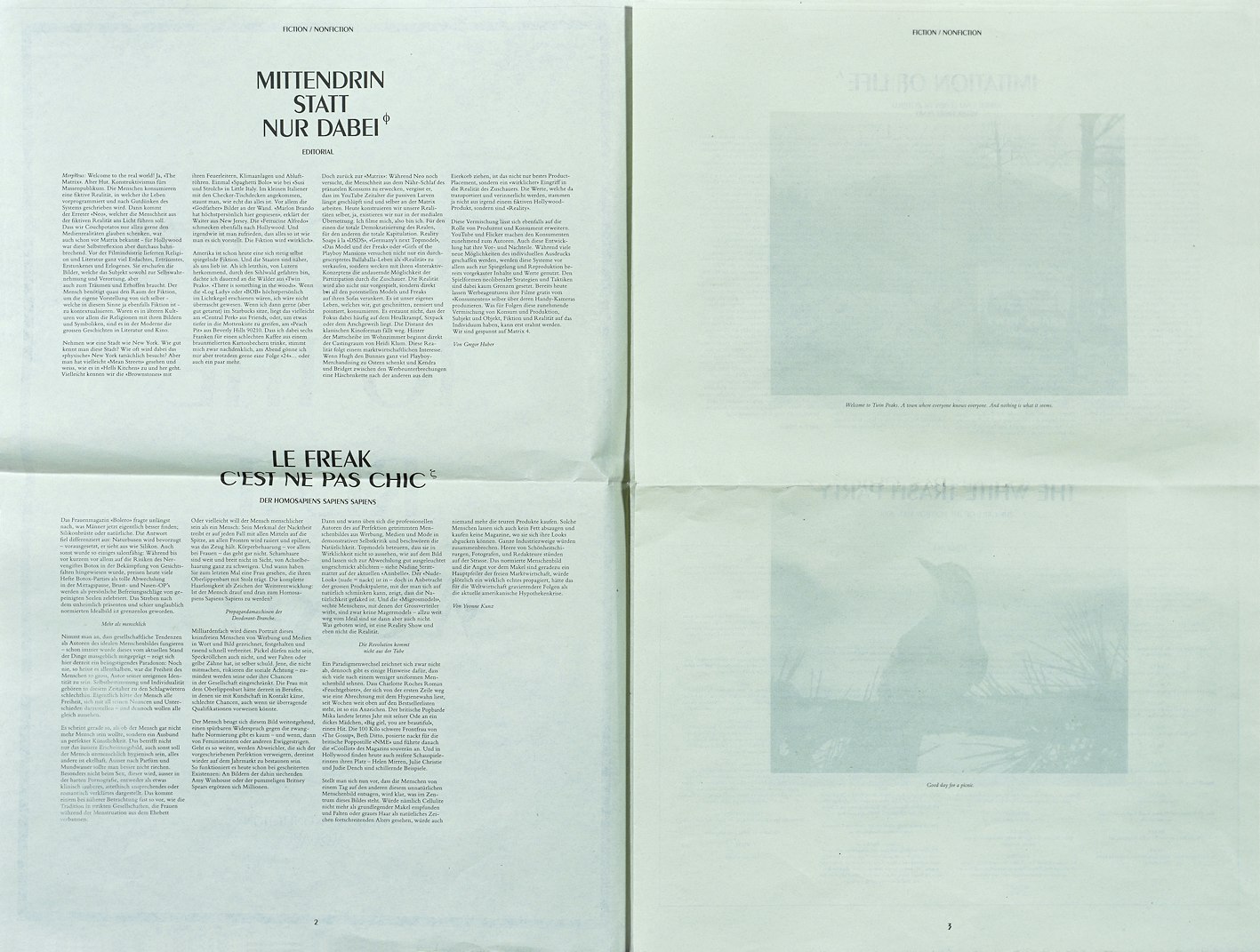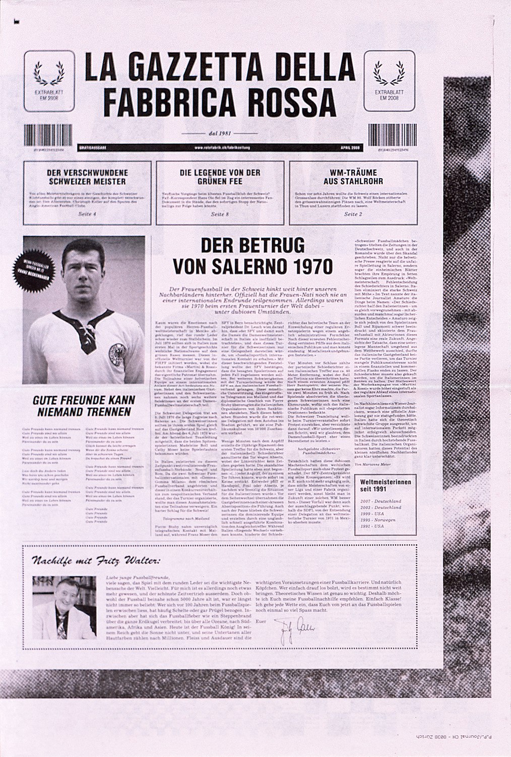 The key to the graphic design of the Rote Fabrik newspaper is that it responds specifically to the current theme of each issue and is freely adapted to suit the topic rather than having to follow a prescribed format. This tailor-made approach means that the design of each issue is unique, brimming with ideas and invariably full of all sorts of surprising and unexpected graphic solutions.