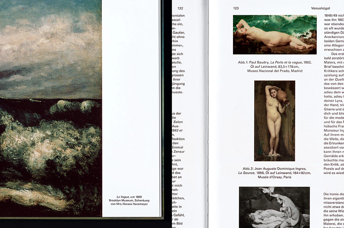 This exhibition catalogue, with its conventional external appearance, has an interior marked by several surprising design decisions that succeed in placing the famous artist in a new light. Here Courbet seems to belong less to the nineteenth century than to the twentieth. The introductory series of full-bleed detail illustrations, which appear in unusual combinations, reveals broad brushwork and sometimes seemingly abstract zones of the paintings. The same effect appears later on when entire paintings are presented in large, full-bleed format. The fact that they run across the gutter, depending on format, is an almost radical departure for traditional art catalogues. The same also applies to the consistently identical type size in the titles, text and captions. The careful editing of the pictures emphasizes individual thematic aspects of Courbet’s paintings in parallel with the scholarly essays. The overall effect is inviting and informative, providing optimal access to the artist’s oeuvre.