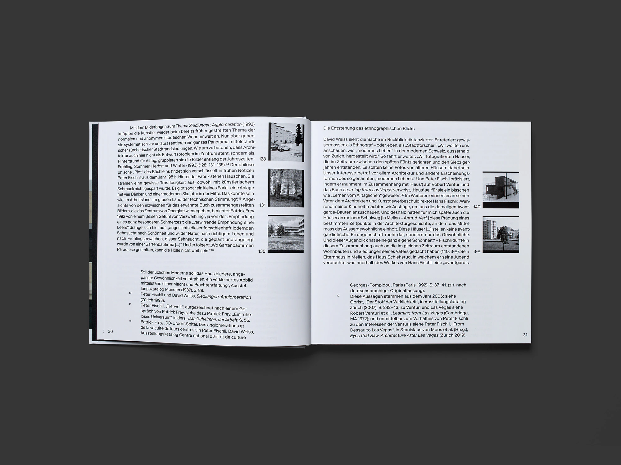 A relatively small-format, square volume with a hardcover proposes an inviting interplay of text and images, and a novel approach to Peter Fischli and David Weiss’s installation Haus, which was built several times between 1987 and 2018. The first section contains an extended essay by emeritus Zurich art historian Stanislaus von Moos, who along with Peter Fischli is also responsible for the book’s concept. The asymmetrical layout leaves space at the right-hand edge of each page for up to three reference illustrations, which are complemented by black bars to create identical squares. Some illustrations appear again, enlarged and in a different sequence, in the image section, which presents almost 200 photographs individually, one to a page, leaving two white margins either to the left and right or at top and bottom. The directory that follows sheds light on the origins of the diverse material, which in addition to a work history of Fischli / Weiss also opens up architectural and art-historical contexts: Max Bill, Hans Fischli, Alison and Peter Smithson and others. The image editing is outstanding, and the historical perspective is underscored by the book’s format, which recalls publications from the heyday of Swiss design.