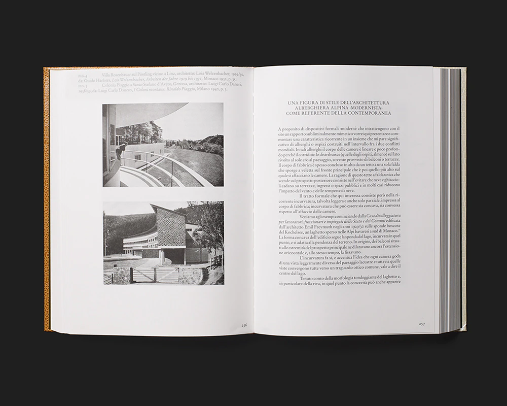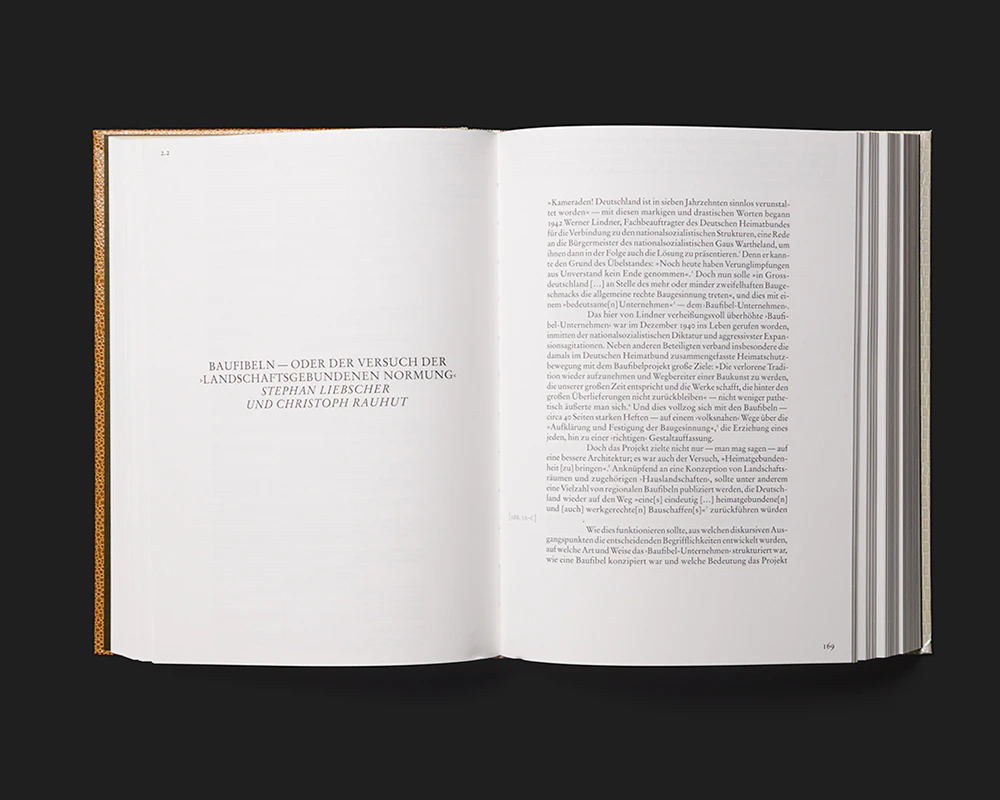 A medium-sized, very extensive hardcover volume with an artificial leather binding contains lavishly illustrated scholarly essays on conceptions of ‘homeland’ in the twentieth century. The historical image material is printed in black and white and four colours enhanced with silver, and all the text is in the Stempel version of Garamond launched in 1920. The result is an apparently familiar image / text typology that is undercut by contemporary details. The essay titles appear in small capitals centred on the left-hand page, while the single-column text begins at top right, with the very small-font endnotes in narrow, densely packed columns. Reference illustrations are numbered and inserted in comparatively large size, mostly alone or in pairs on individual pages. The large-font captions in silver are placed at the top edge of each page. With its foil-stamped cover, slightly translucent paper (which exposes the grid) and gilt edging on one side, the book is deliberately grandiose. The attractive volume is thus revealed as a construct that, just like conceptions of ‘homeland’, is subject to historical change.