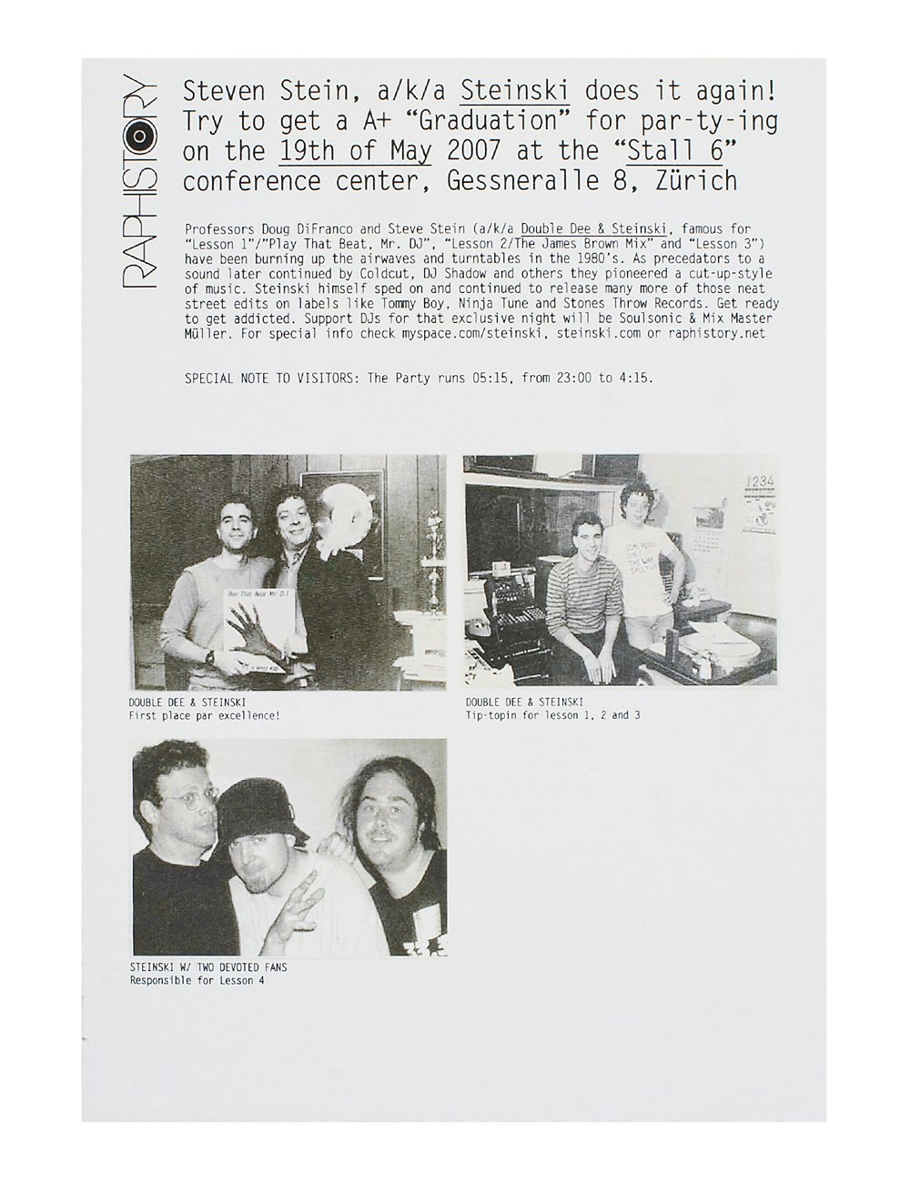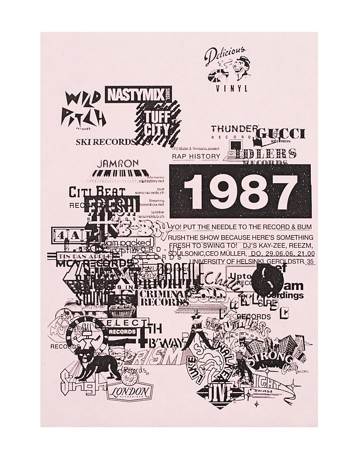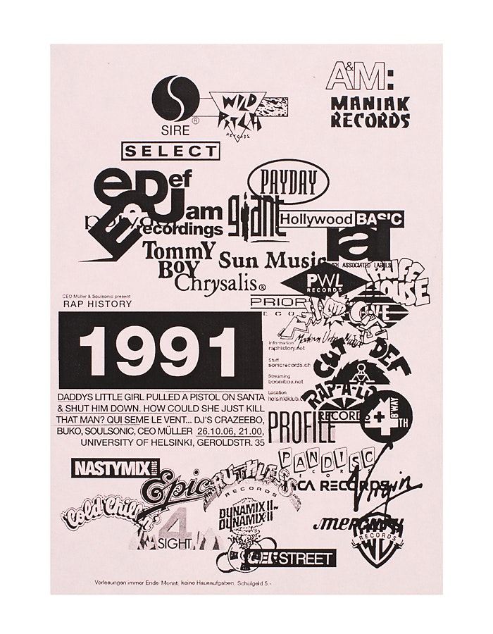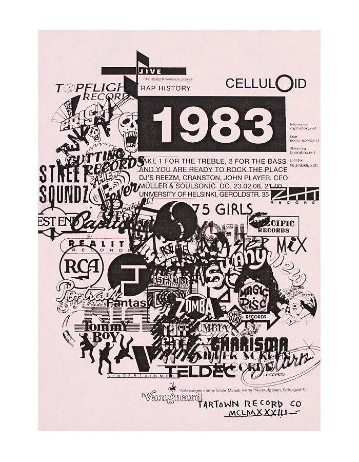 With 'Rap History', a project that is at the same time ambitious and focussed, Ivan Sterzinger opens one of the most important cultural phenomena of recent times up to direct experience. Aiming to inform the fans and the mass of ignoramuses about the music and its cultural background as accurately as possible, the author of the website provides plenty of information about the well-established music culture on the internet platform www.raphistory.net. It has now grown into quite a remarkable list: 2240 rap records by 2126 different artists and 769 labels, a genesis of rap from its beginnings (1979) to the present (2007). Ivan Sterzinger, aka DJ CEO Müller, is more interested in the music itself than in compiling the most comprehensive list possible of all rap records ever released. His actual medium is the party. Together with Klemens Wempe, he therefore opened the doors to the 'University of Helsinki' in the Zurich based club 'Helsinki' more than 30 times. DJs become professors, researchers or specialists and the specially produced tapes, posters and fanzines become teaching material. The visual appearance is outstanding: it is impressive how this project manager and graphic designer has managed to canonise the almost unmanageable diversity of a music genre. The concise and memorable language he has found reflects itself in particular in the symbolic condensation of the record company's logos laid on top of one another. You can get a feel for the new releases year after year and the existing labels are placed on top of each other. This produces a condensate complemented by concise text fragments of songs that stick in your mind. 'Rap History' is therefore far more than just decorative event design. 'Rap History' is a well-rounded edutainment package that opens musical education up to direct experience, without making too much of an effort.
