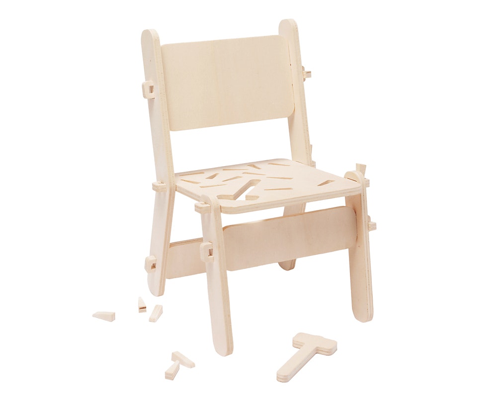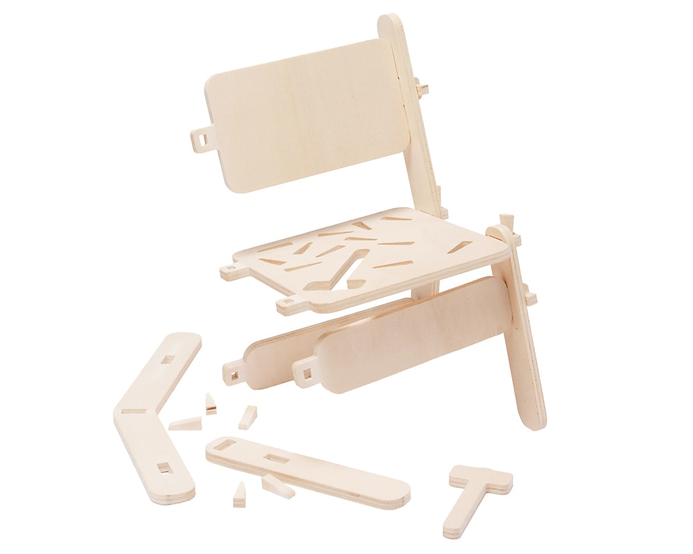 The 'BricOLo' mini high chair designed with Fabien Cappello, isn't held together by nails and screws either, but by timber wedges. Children can assemble their furniture themselves. Inspired by traditional wooden toys, they can then get going on the jigsaw puzzle with the remaining jigsawed shapes on the seat. The hammer is a formal reminder of the tools that are not required here. The chair fosters the children's skills in putting together furniture themselves, an early preparation for their future in the age of IKEA.