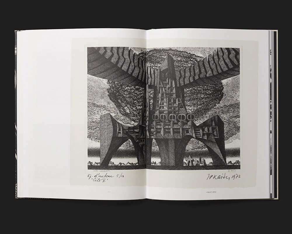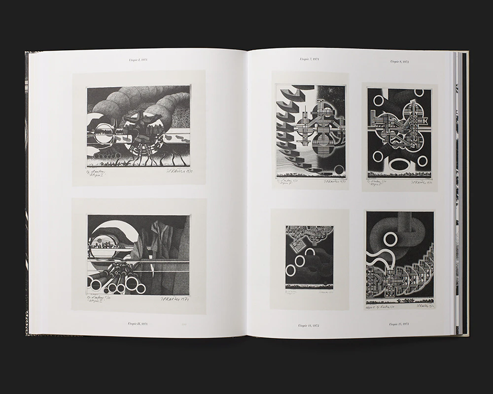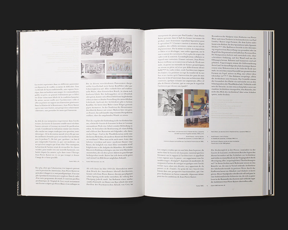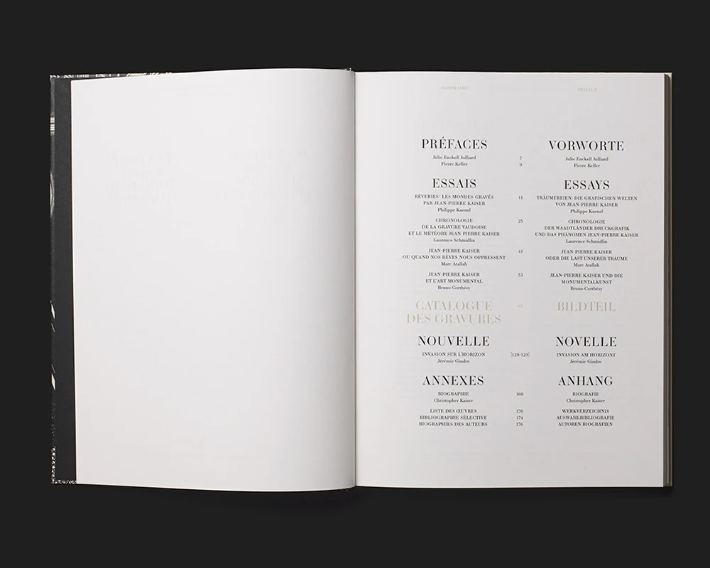 The monograph on the prints of Lausanne artist Jean-Pierre Kaiser (1915–2001) employs some unconventional design ideas that are executed with control and can be well understood. Text is either black or printed in a tasteful light beige, and after a while the light beige begins to bleed across the pages of text like a barely visible spectral manifestation. The essays in German and French are placed side by side, each in a justified column, and two techniques are used to ensure that they remain parallel despite their differing lengths: first, the footnotes are inserted into the columns of text at the end of each paragraph so as to be at the same level (and symmetrical to each other toward the middle of the page); second, the reference images are positioned in the shorter column of text (though slightly offset), with the monolingual explanations next to them. The light beige reappears in the table section as a background, and in the appendix (again in two languages) the images are positioned centrally so that they extend symmetrically into the two columns. The end product is a self-contained and lavish museum publication.
