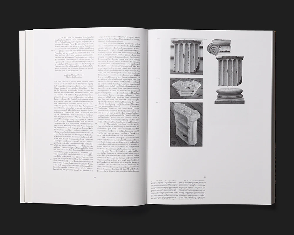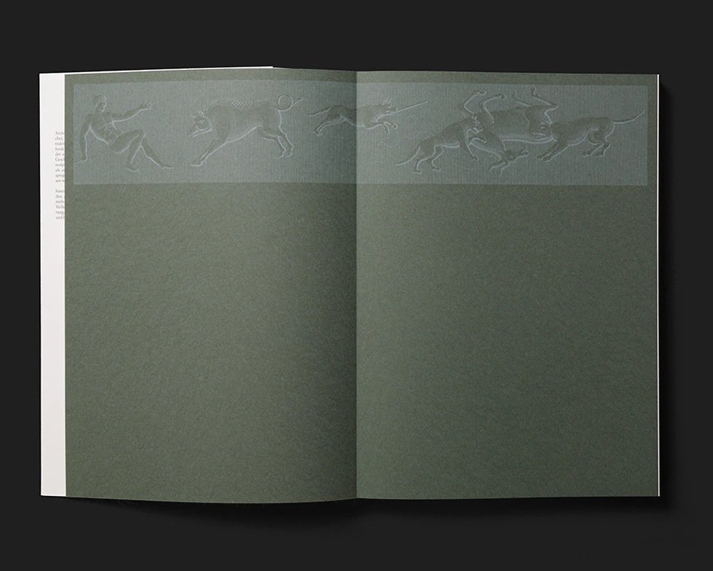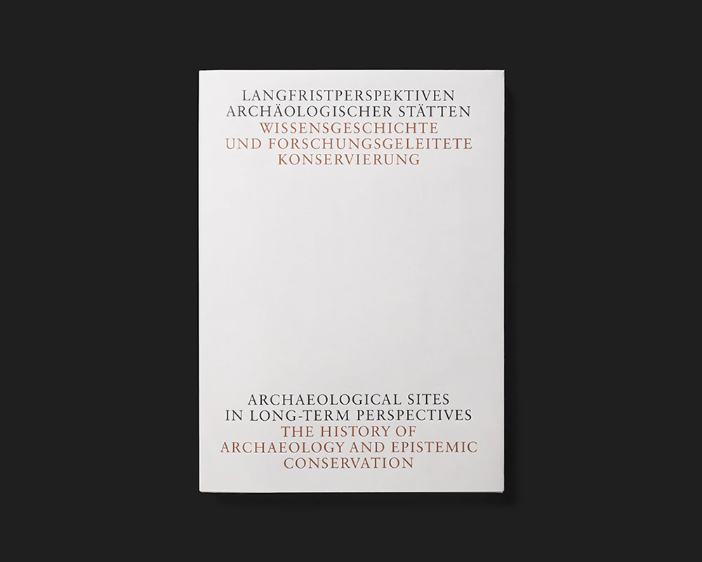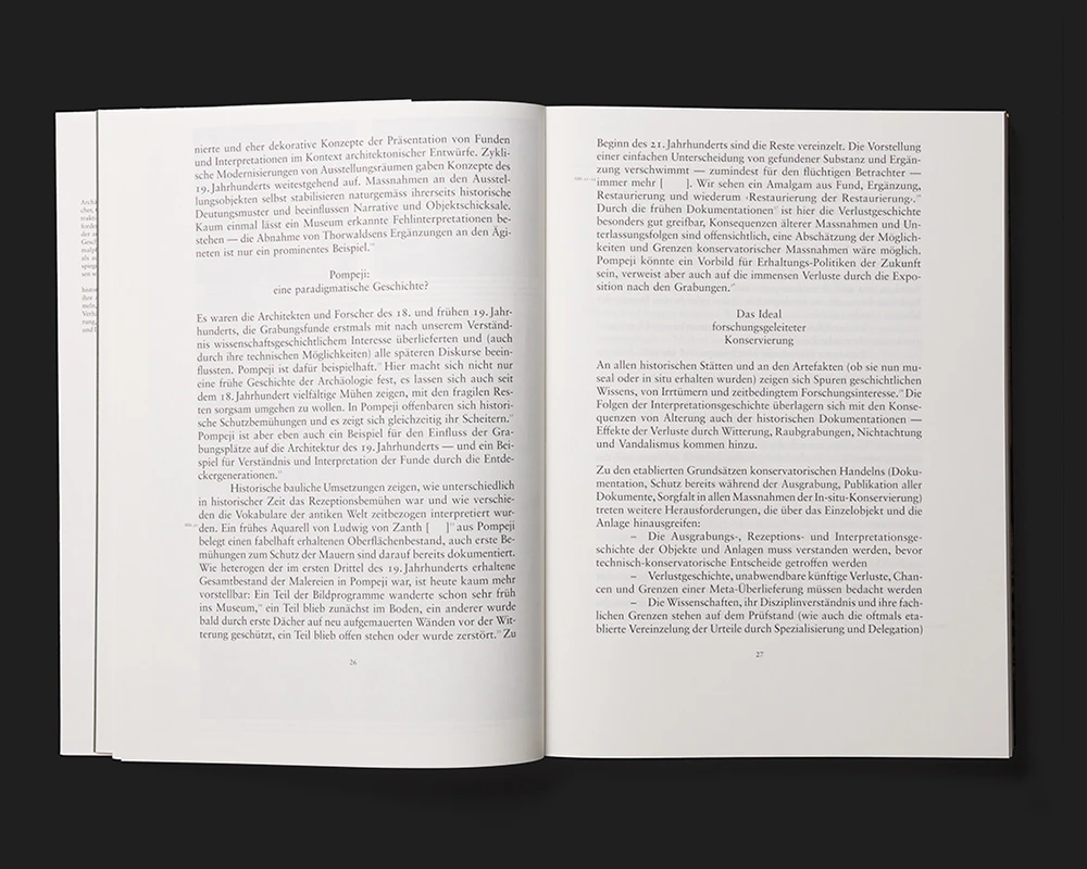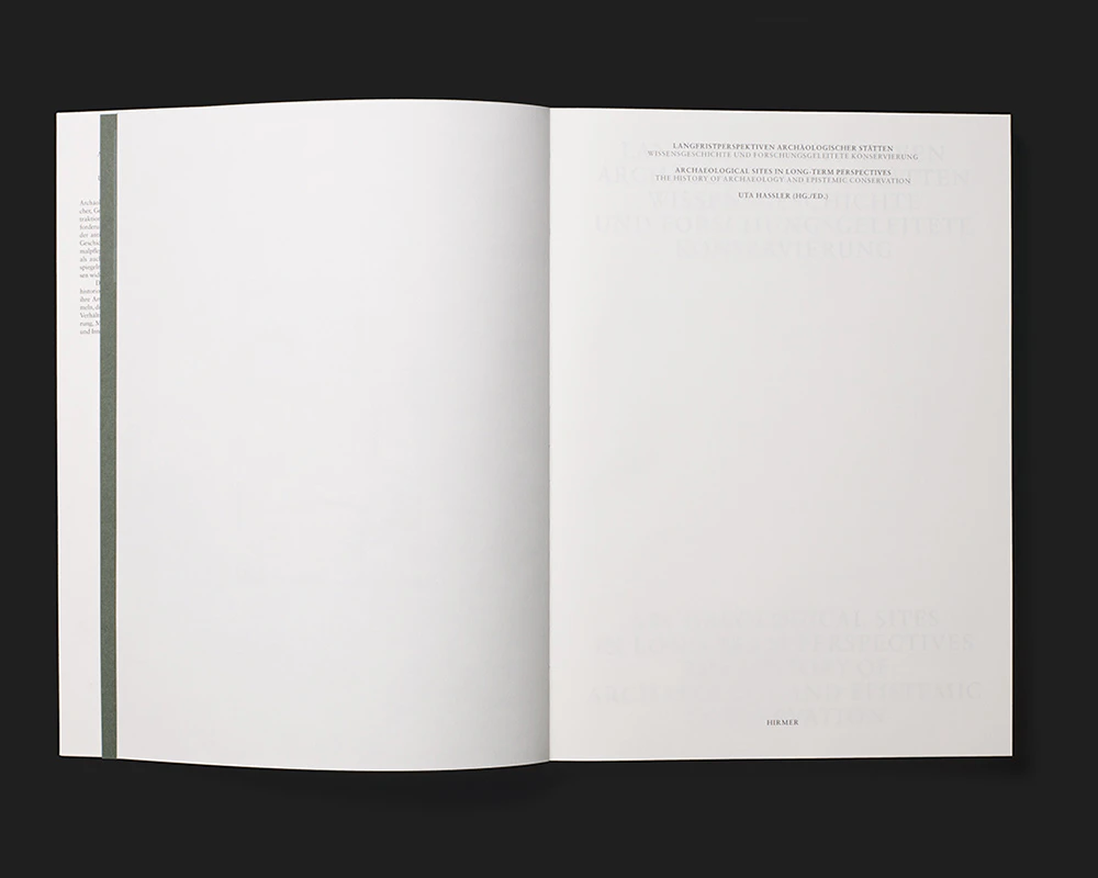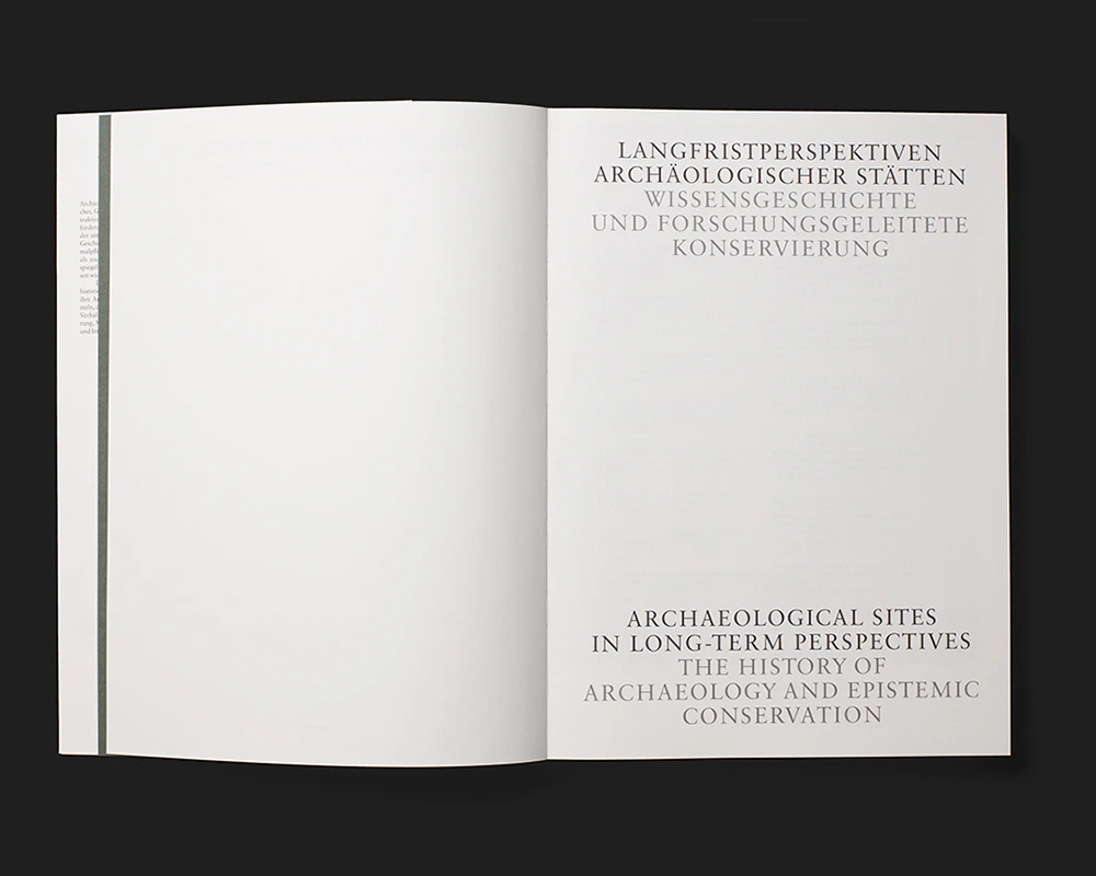 A collection of essays on the discovery and preservation of archaeological sites appears inviting and light thanks to a design that is sophisticated in every detail. Despite the large format and considerable weight, the initial impression is of elegance, which is underscored by the softcover with fold-outs made from three materials glued together and the different coloured endpapers at front and back. The essays, almost twenty in number, are set in the typeface Sabon in two columns on coated paper, each preceded by centred titles in upper case with ample leading. The introduction is in larger type; here a second, uncoated paper has been used, individual sheets of which are wrapped around the sections made of the first paper and bear between one and six reference illustrations arranged with white space. Further illustrations are integrated into the text, their breadth precisely matching the column, and certain typographical details stand out, such as empty brackets in the text as placeholders for the illustration numbers at the column’s edge and the extremely small footnotes. The effect is to derive surprising design elements from the rulebook of the academic book genre.