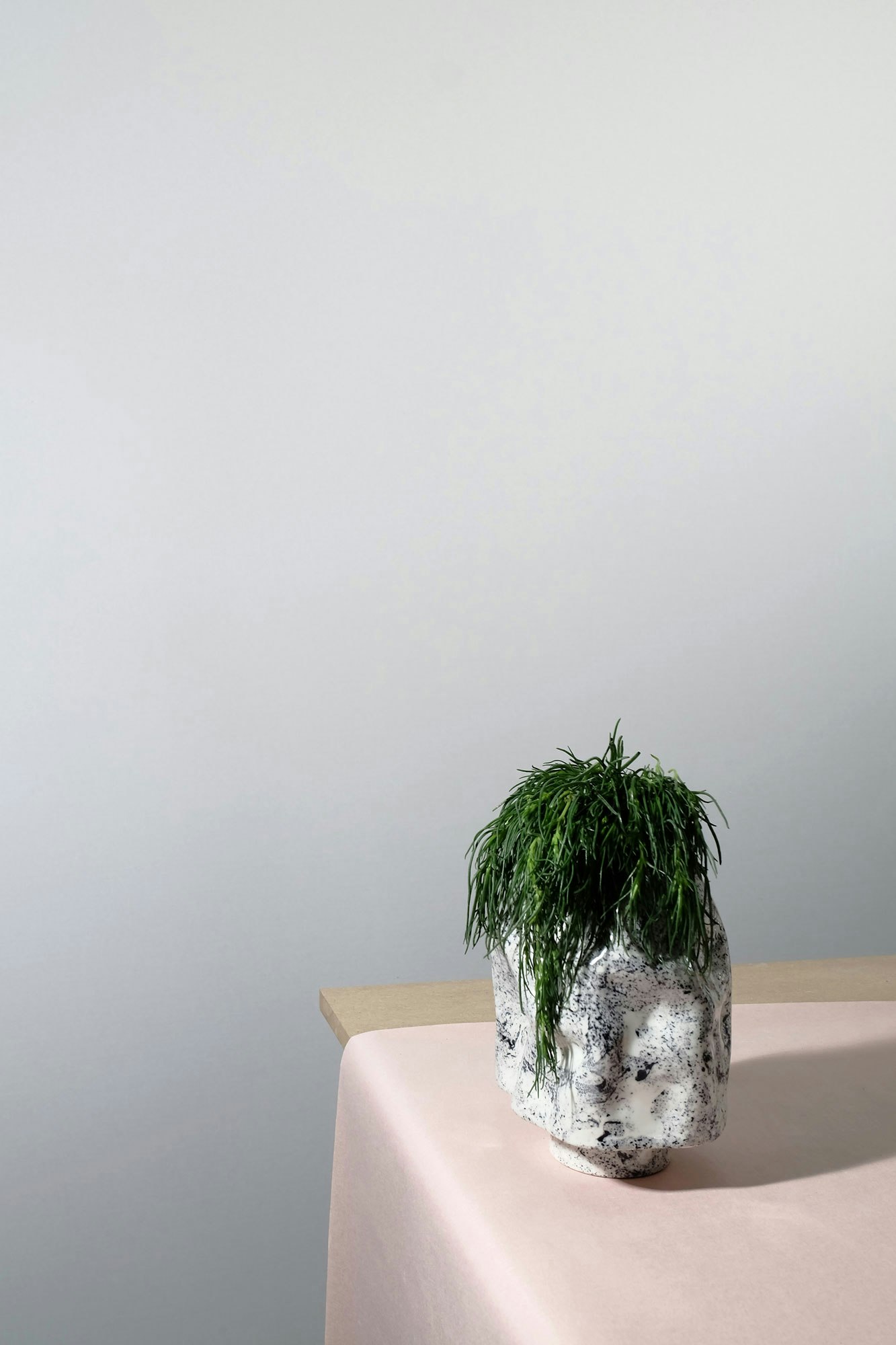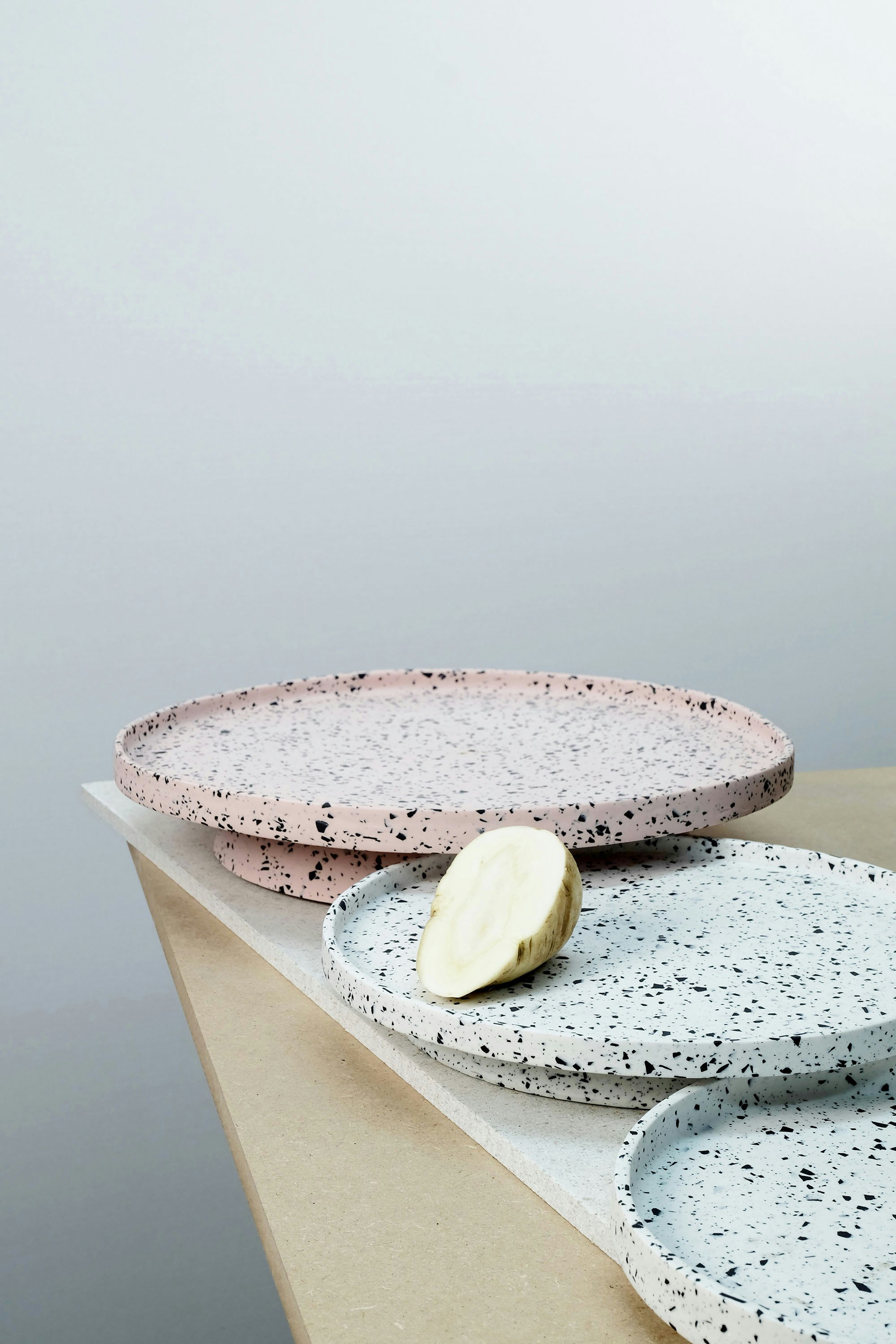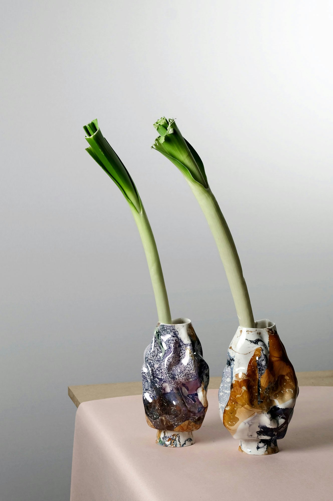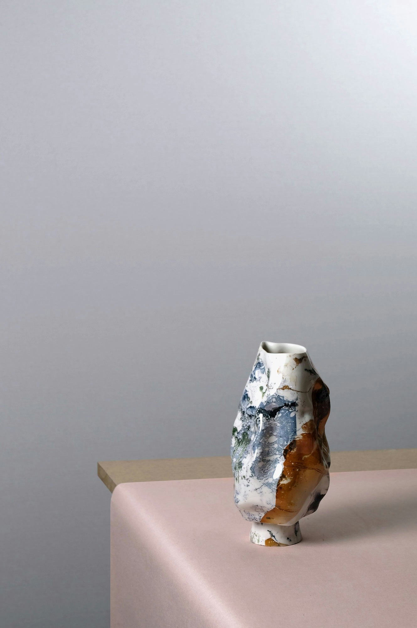 The porcelain crafted by Laurin Schaub recalls cast stone. Lustrous colors emerge in the kiln, with glazed surfaces inspired by marbled paper. Out of his perfect self-turned platters and amorphous vases, the designer puts together a kind of landscape.