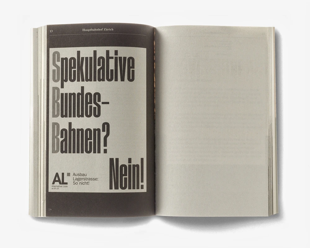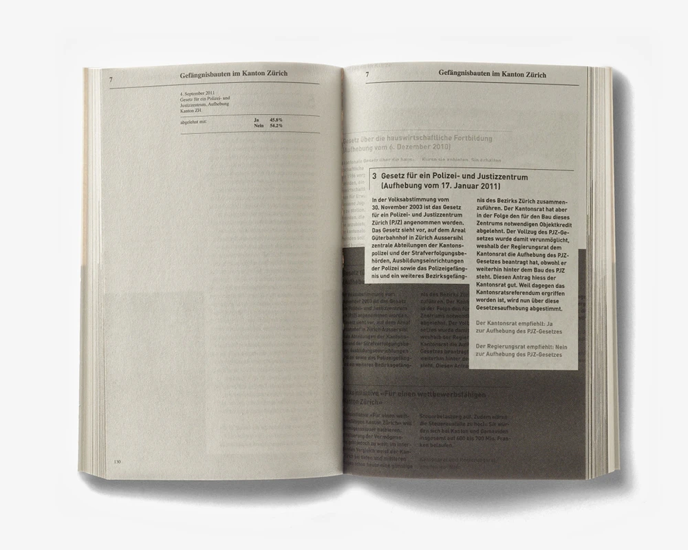 The Berlin-based architect Arno Brandlhuber and his team document 17 referendums on architectural issues in Switzerland since the early 1980s. The small-format, black-and-white softcover impressively handles a wide range of texts and visuals that have been deliberately treated to give them the feeling of archival materials. Campaign posters, historical photographs and other items, with any colour removed, are presented singly or in pairs on a page, without commentary, their size adjusted to the uniform type area. Between them are excerpts from draft laws, referendum proposals and brochures. Everything is readable and recognisable at first glance - vital in a political campaign - while the page headers ensure the reader always knows which vote is being referred to. The juxtaposition of divergent voices underscores the complexity of the topic, while the loose sequence of various images, texts and combinations of the two raises further questions about the relationship between the written medium of the law and the visual medium of architecture.