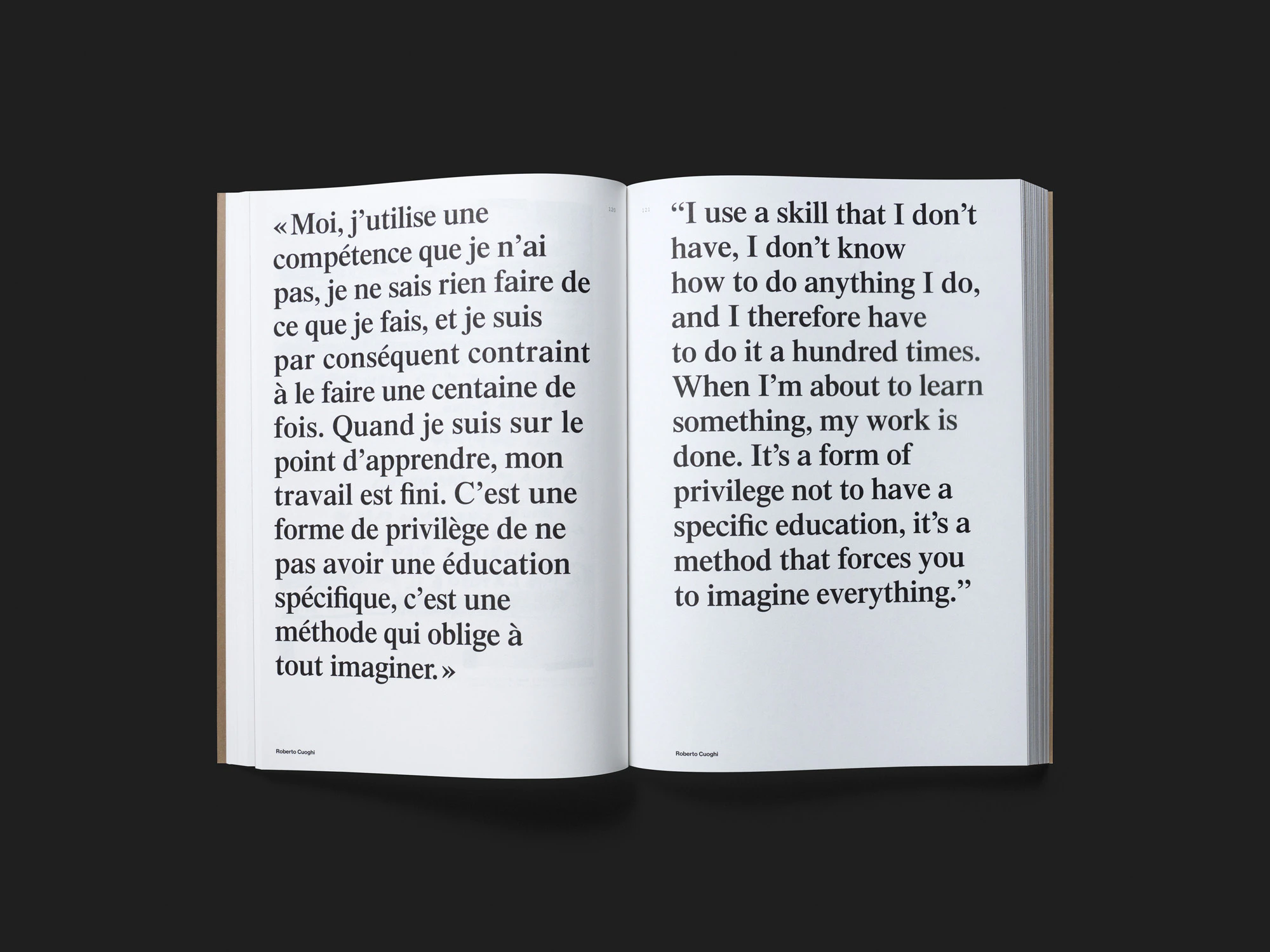 An exhibition catalogue on autodidacticism in the visual arts, the product of research by a university lecturer, is a compellingly simple yet substantial archive book with a straightforward design. A number of illustrated essays in a two-column layout and a serif font are followed by the catalogue section proper, with six thematic sections. Each begins with a single brown sheet, similar to the softcover, and presents a selection of self-taught processes and strategies with reference to the works of five to eight artists. All the participants – some very well known, others hardly at all – are allocated two pages of text and two of images, always in the same layout. For an exhibition catalogue containing such magnificent images it appears almost simplistic at first, but the raw archive form wins through in the end. The avoidance of any form of hierarchy or narrative means that all the works are accorded equal status, in line with the self-taught approach. The design of the front and back covers stands out, while the illustration of a work used as a title image – a one-way street sign divided into two – hints at the autodidact’s absence of rules.