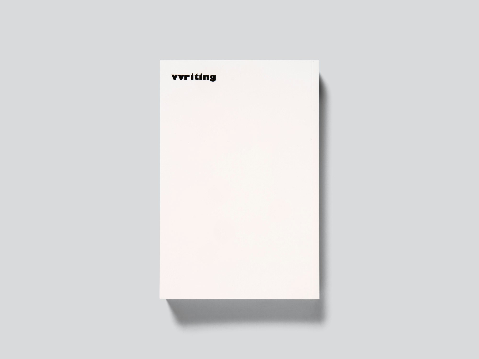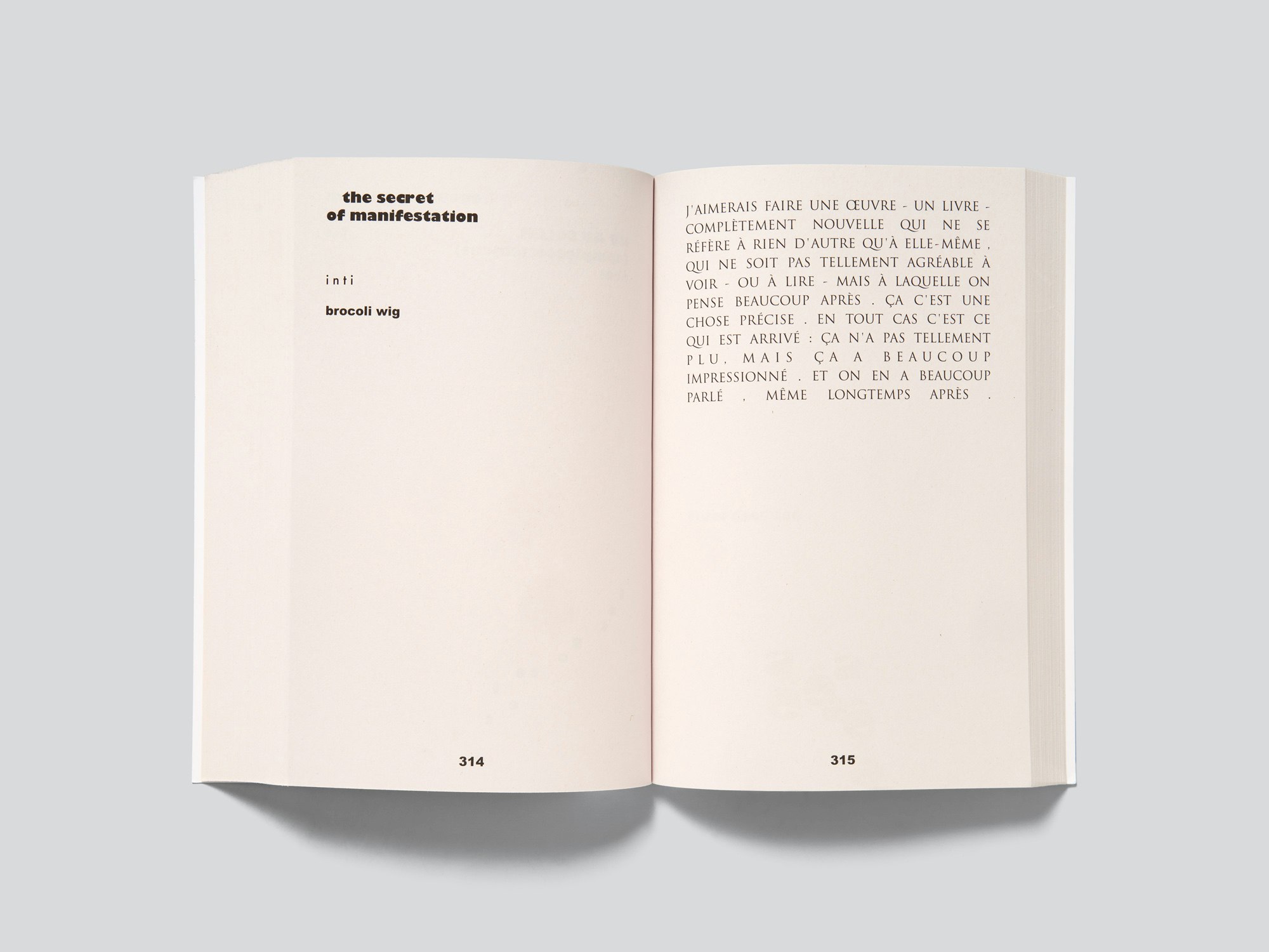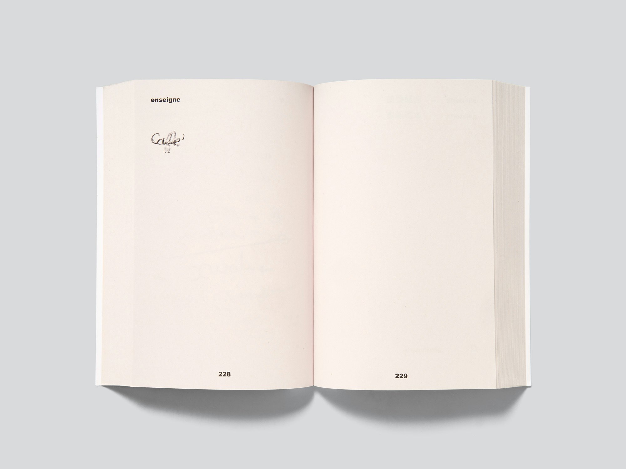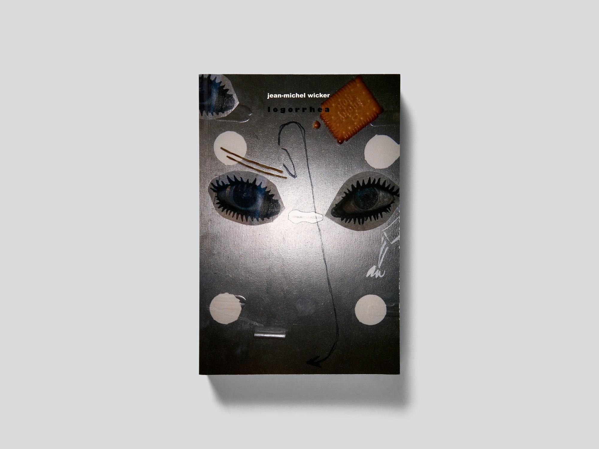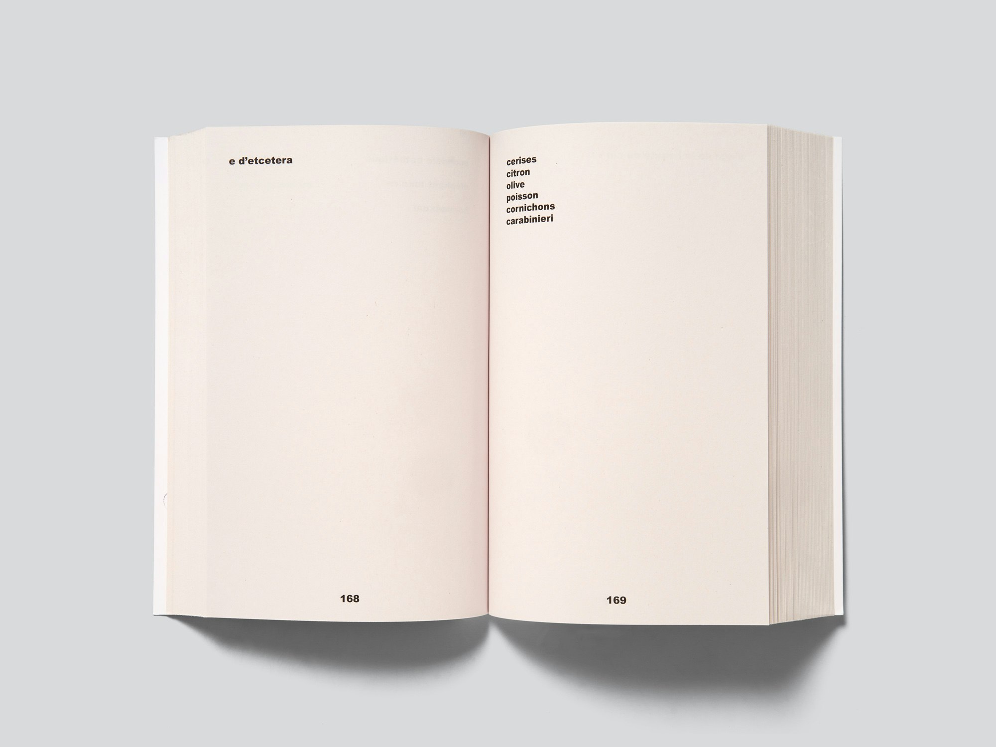 Realised in close collaboration with the designer, an artist’s book focusing on the written word in Jean-Michel Wicker’s work becomes a harmonious object in which words, fonts and typography work closely together. At first glance it looks like an inexpensive paperback – a laminated cover, a collage on the front and 466 black-and-white pages on thick but lightweight recycled paper. Yet the inside of the cover and the half-title subvert these expectations – another collage, featuring a few tiny e’s, is found on the left-hand page, and a giant black e is on the right. An introductory essay is mostly set in a serif font, but a few words and sentences in Gill Sans Bold stand out. The bold Gill is then used as the main font throughout the book in which short notes or isolated sentences appear alone on a page, often at the top of the print space, but occasionally freely positioned. There is a lot of white space throughout, and some pages and spreads are left completely blank except for the page number. The unconventional orthography is strongly orientated on pronunciation, underlined by typographical quirks such as the use of ‘vv’ in place of ‘w’. As the book progresses design variations increase: a page printed in fluorescent yellow, decorative fonts and doodles, inverted letters and a few drawings. The typography often reflects the humour of the texts, but it is not overly dynamic, allowing all the words and text compositions to speak for themselves. The work successfully plays with the traditional visuals and design idioms of a text book.