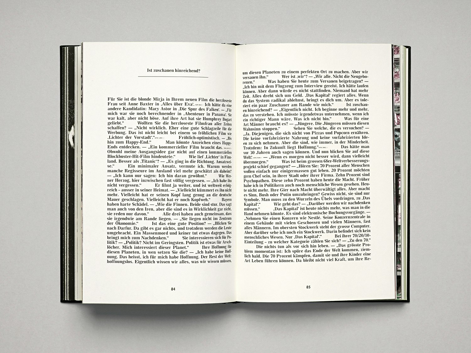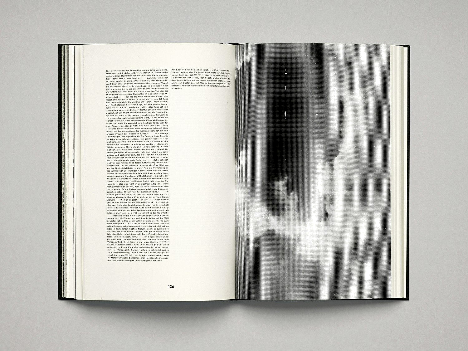 As in a film, the content of Akilandia is conveyed by the dramatic structure and sequencing of the images. The book is made up for the most part of a wide variety of visual material. For instance, chapters are introduced by quotations from the filmmaker, presented as double-page spreads. This almost rebellious design is very much in the spirit of Kaurismäki, as is the AkiNewsBold font created by Kryenbühl/Weiss – a variation on the Cg News font – with its slightly uneven look that corresponds to the filmmaker's unorthodox thinking. The text in black was printed digitally, while the colour images were later added individually using an old inkjet printer, lending them an unusual and quirky charm.