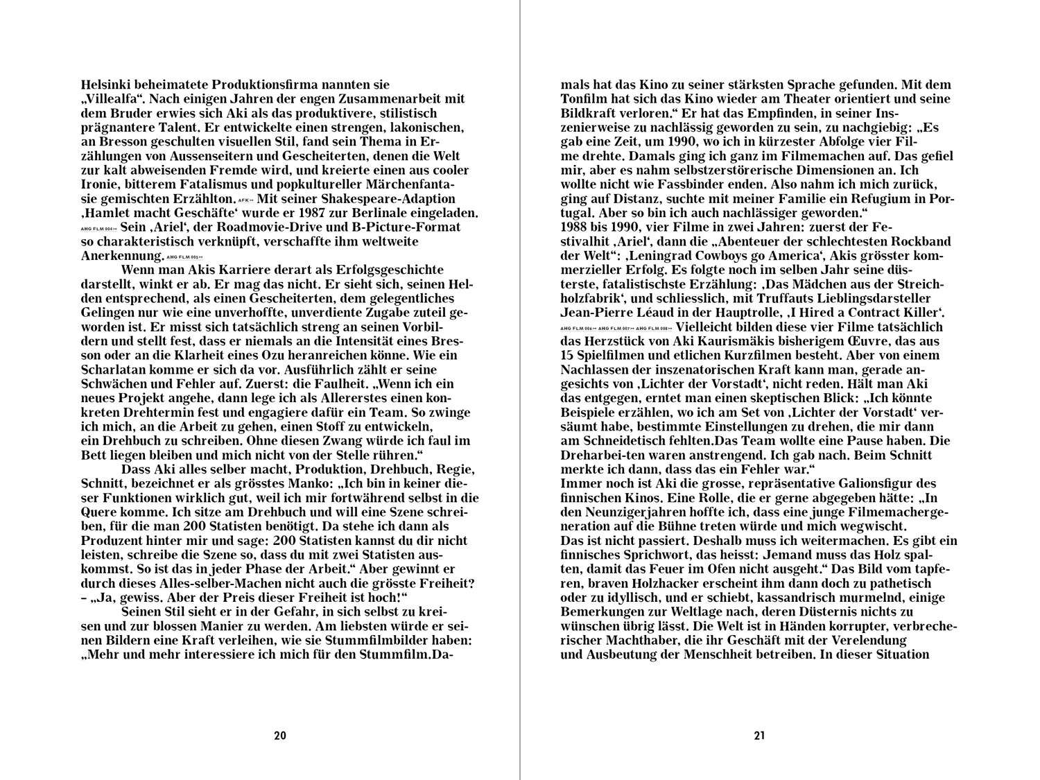 Compelling in terms of both content and design, Akilandia is remarkable for its typography, overall structure and painstaking research. Kryenbühl/Weiss have succeeded in creating a complex and insightful survey of Kaurismäki's cinematic oeuvre, which they present with enormous subtlety, a generous dash of wit and a touch of rugged Finnish individualism.