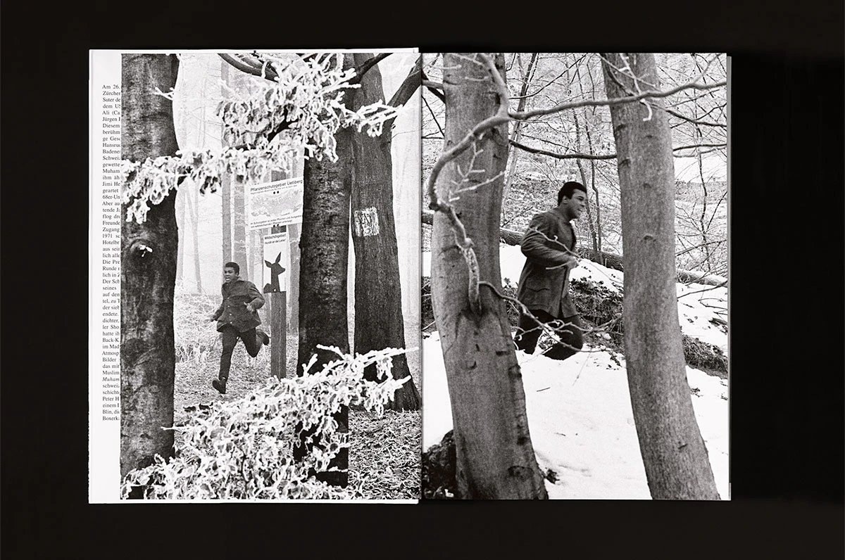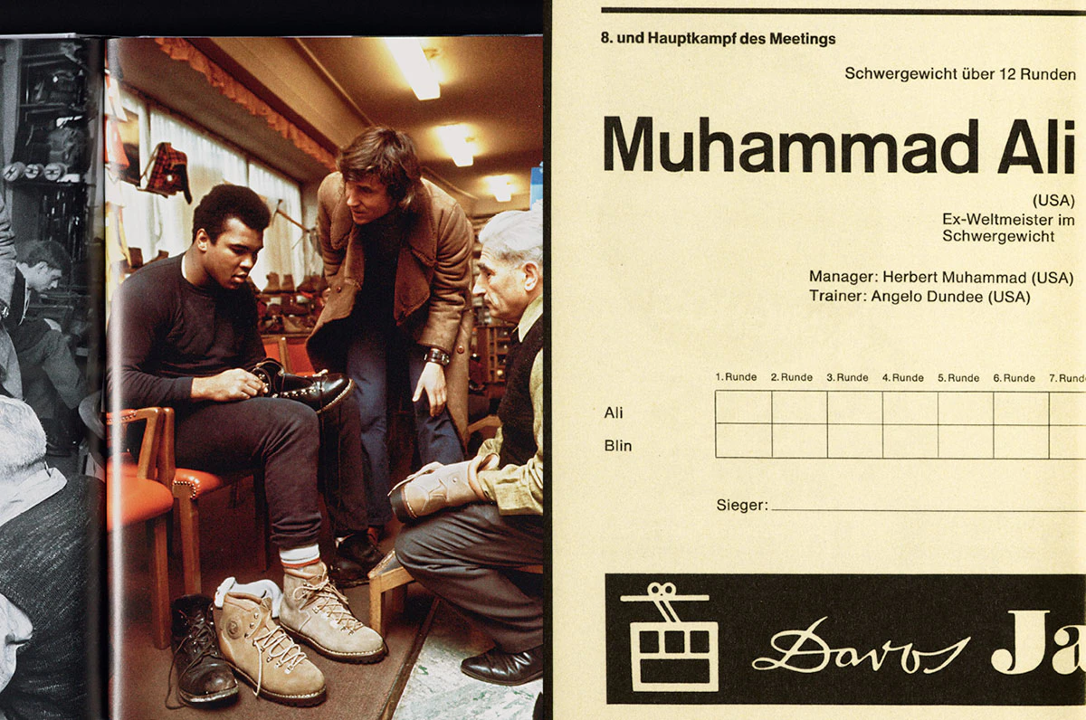 This fascinating illustrated book with photos by Eric Bachmann, who accompanied Muhammad Ali before his fight against Jürgen Blin in Zurich’s Hallenstadion, functions like a time capsule. The large number of pictures ─ often several from a single situation or scene ─ creates a film-like impression. The chronological arrangement produces the effect of a kind of ‘day in the life of Zurich’ in 1971. The quality of the reproductions is high and the design, with full-bleed images on one or two pages each, appears almost timeless. This impression is reinforced by the use of a hardback cover with a dust jacket. An informative closing section of the book provides short biographical notes in dictionary form on the people who appear in the pictures alongside Ali as well as a complete reproduction of every page of the fight programme. This is a warm, affectionate book.
