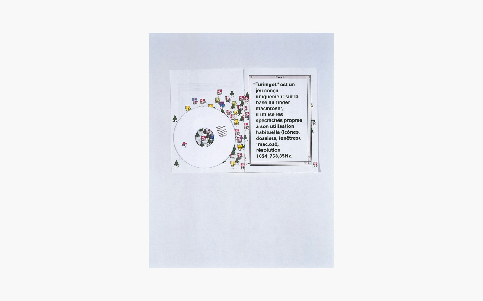 The multi-media designer Nicolas Party's 'Turimgot' is a computer game based on the Mac Finder and using the operating system's own ordering structure and computer language. A first dialogue window provides an introduction, explanation and a 'sac à information'. Players are required to rescue the world of Turimgot, which has been plunged into disaster and turmoil, with the aid of information and solved problems collected in seven different countries. Nicolas Party builds up the game landscapes that are to be traversed without large-scale visual effects, but with modest, affectionate and very reduced graphics. It is a game whose complex structure is probably attractive above all to an inveterate games community. In comparison with traditional computer games, 'Turimgot' prescribes an unusually slow tempo for the game, which fits in extremely well with the poetic textual and pictorial language.