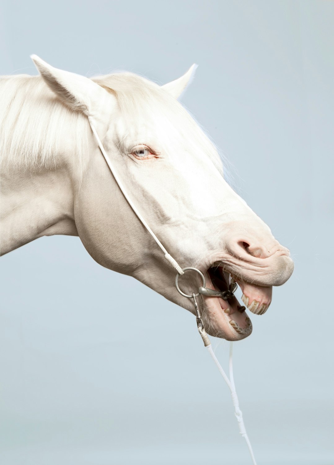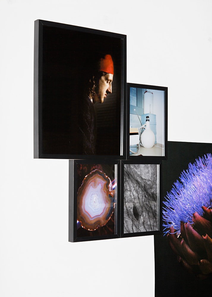 How does one combine very different photographic images? The Lausanne-based designer Olga Cafiero completed her master's degree in Art Direction at the ECAL in 2011. In her work 'Curioso', she follows the principle of the curio cabinet. Just as in an encyclopaedia, a collector brings together very different objects. Since these are combined according to his taste, interests and passions, collecting is a very subjective undertaking which creates a personal and often even magical world. In changing combinations, Olga Cafiero shows her photographic works: very colourful plant images, huge machines, portraits, mysterious animal skeletons partially covered with a white cloth, a grotesque monkey head made of plaster with its mouth wide open, a table lamp. The atmosphere of the individual photographs is very different: it varies from banal and down to earth to uncanny. Through her very personal way of hanging the photos, Olga Cafiero aims to bring about an encounter between the world of science and that of magic. Science and magic, which used to be closely related but were increasingly separated from each other in the course of history, come face to face in her assemblages. Olga Cafiero writes that with her mixture of architectural photos, still lifes and documentary photography, she questions photography as such. Her chief motive is her curiosity, and it is precisely this curiosity that she would like to arouse in the viewer. Taking a close look and playing guessing games pay off for the viewer: what do the extremely sober, clinically clean pictures of production facilities have to do with portraits whose lighting is reminiscent of Renaissance painting? Cafiero sharpens our eye for strange details: why are the buttons and hoses in her pictures of machinery so colourful? In her visual cosmos, Olga Cafiero is looking for 'subliminal' tensions and connections between individual images.