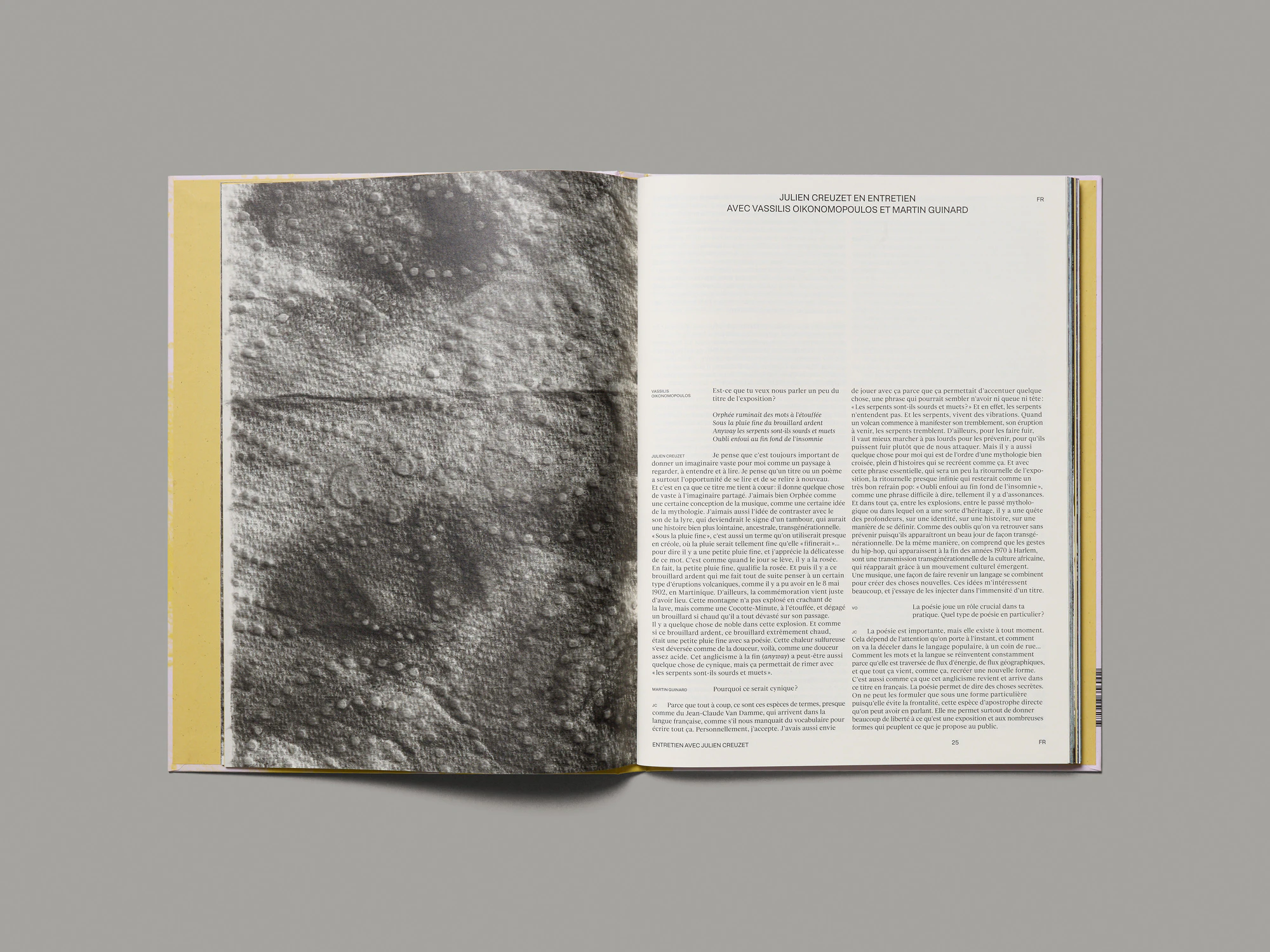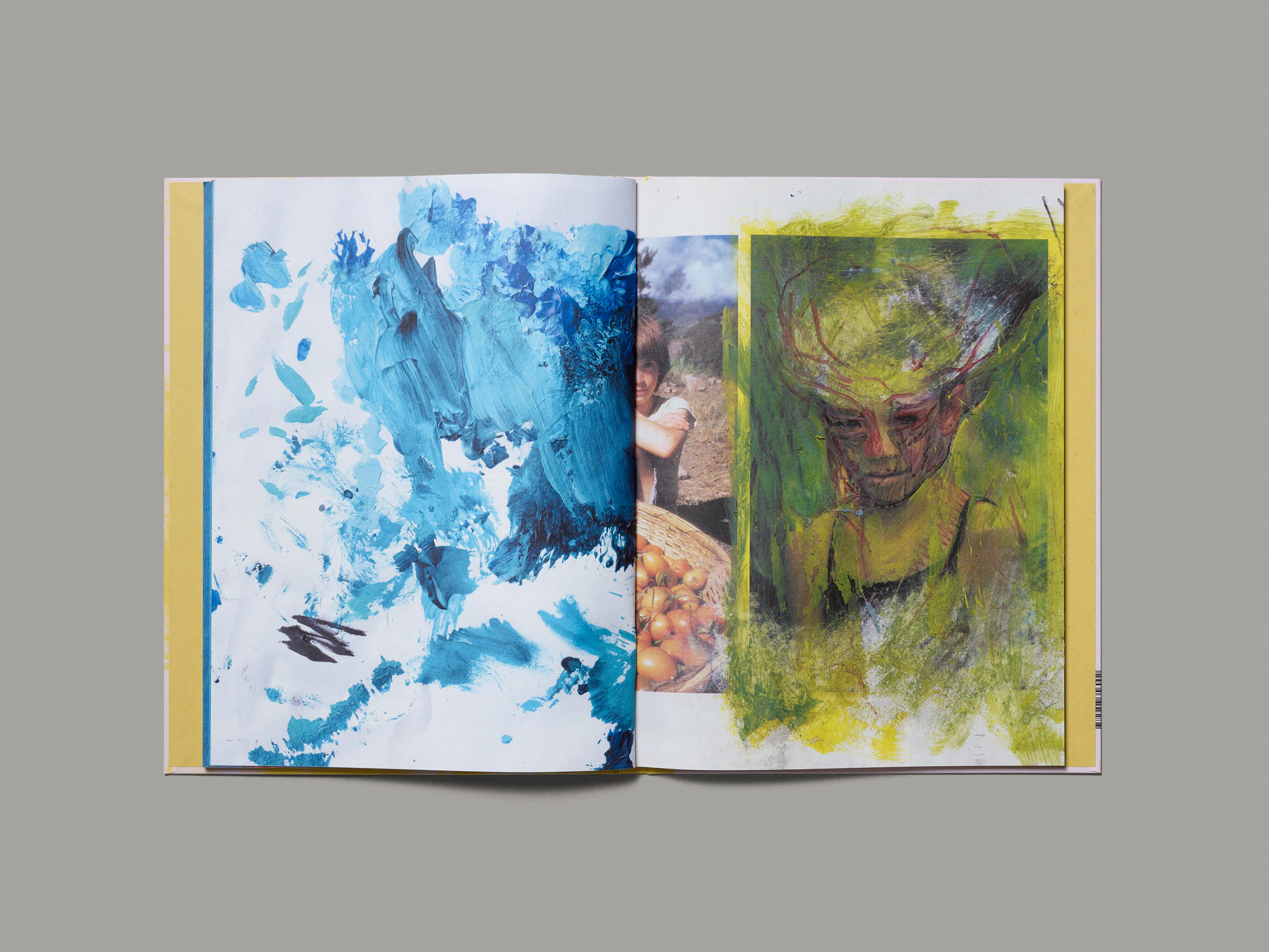 The first thing that stands out about this colourful exhibition catalogue for the young Martinican artist Julien Creuzet is the precision with which it is crafted: a stack consisting of three different types of paper is paradoxically stapled into the spine of a hardcover. The alternating use of paper structures the book into various picture and text sections which stand alone but also interact well. Some texts appear on two types of uncoated yellow- toned paper, varying in format and with almost no images. A series of letters to the artist and a chapter of a book written by André Breton in the 1940s are included in the form of high-contrast photocopies. The five picture sections feature images reproduced entirely full bleed: one with figurative drawings and paintings by Creuzet, and the other four with abstract details from historical paintings of sunsets at sea, which Creuzet photographed from books before editing out all figurative elements. In the exhibition, these abstract sections were inserted into ceiling-mounted lightboxes, helping to light the space, and in the book the use of coated paper brings the fascinating changes of colour to the fore. The design treatment of all the materials is raw and direct and produces both a delightful sense of nonchalance and a strong energy. There is no white anywhere in the book.