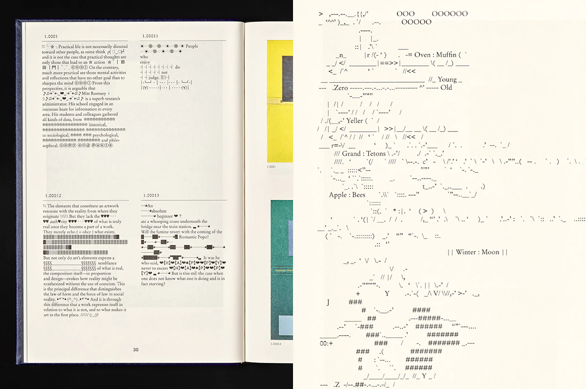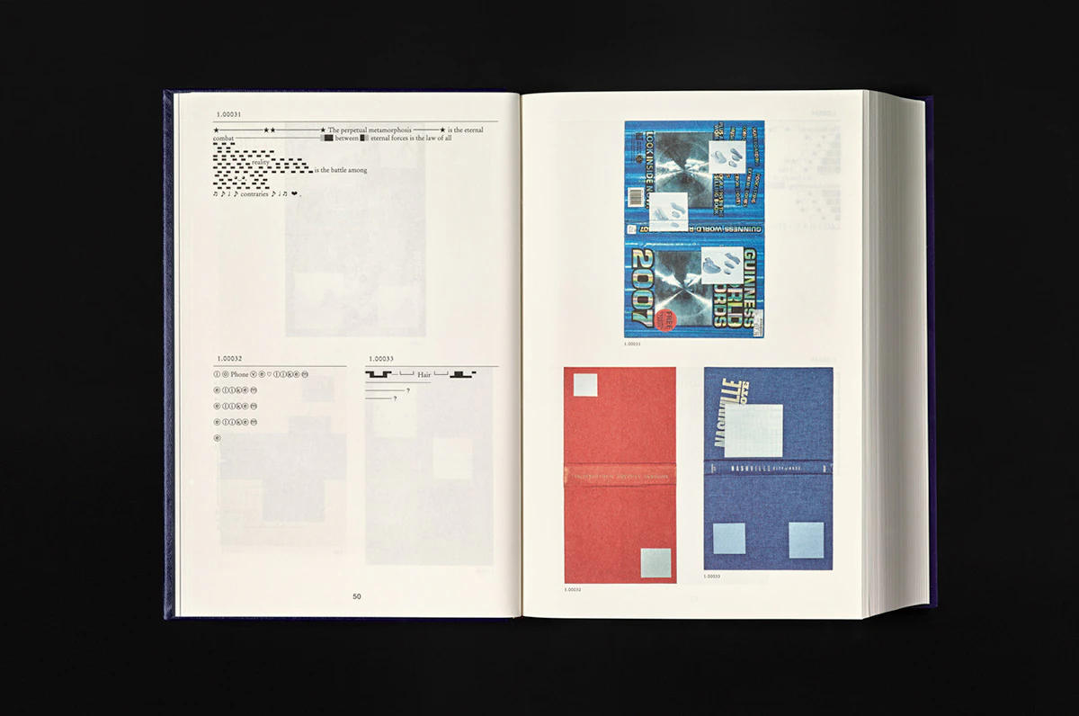This heavy, leather-bound book on Paul Chan’s Volumes series of artworks has the outward appearance of a bible or book of statutes, while inside it looks mysterious or even confusing. The 1,005 works illustrated consist of one volume each from which all of the pages were torn out before Chan decorated their covers with small, mostly abstract or monochrome ‘paintings’. The illustrations are all set on the right-hand page and are contrasted on the left with short cryptic texts by Chan with numerous gaps and special characters that make them seem at times like concrete poetry and at others like text puzzles or decomposing text fragments. The content thus undermines the printed book’s traditional claim to authority in several ways, while the publication still cultivates that claim in a purely external way ─ through its classic design, size and masterly manufacture in a centuries-old Swiss printing house. The result is a ‘testament’ to book culture in the digital age, and it is not incidental that it is also available as an e-book from Paul Chan’s publishing house, Badlands Unlimited.