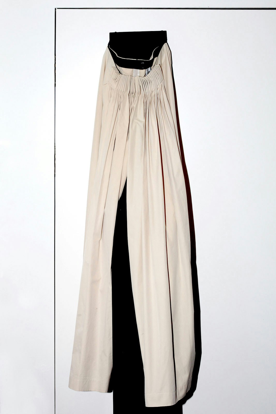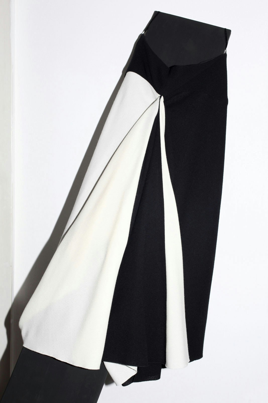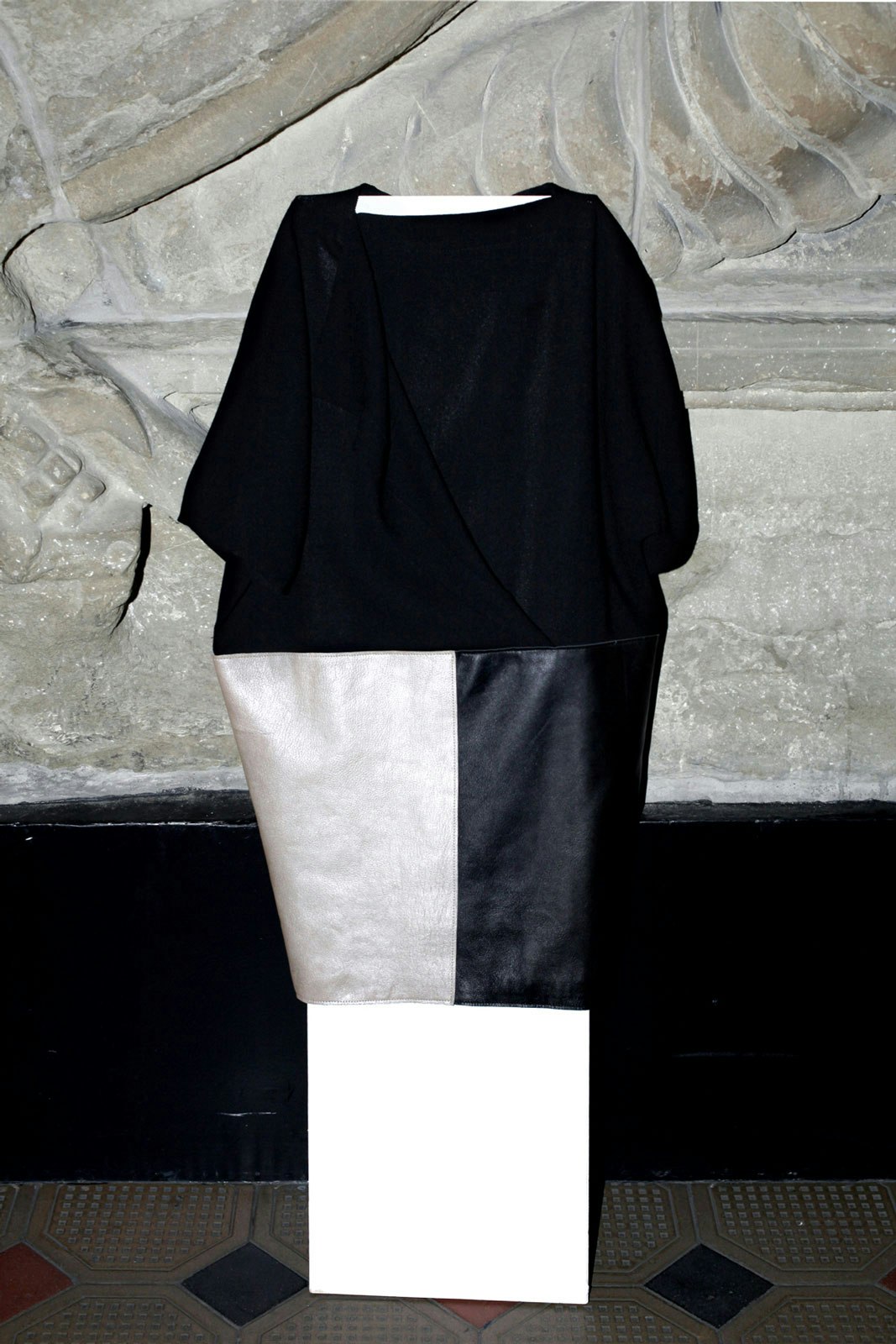 'Croisière 11' is based on three basic cuts and consists of 25 different looks. In the design process, the first cut was always a back to front movement, like a sweeping embrace. The fabrics are placed on the body from behind, with the spine as the starting point for the composition. An embrace is also the aspiration for how it should feel to wear these clothes. Almost all the pieces have an accentuated seam at the spine, which breaks up the flat surface of the back and permits an elongation of the wearer's silhouette. Side seams are largely absent. The front and rear view are generally geometrical in shape, whereas the sides play with volumes and bring a certain energy into the design.