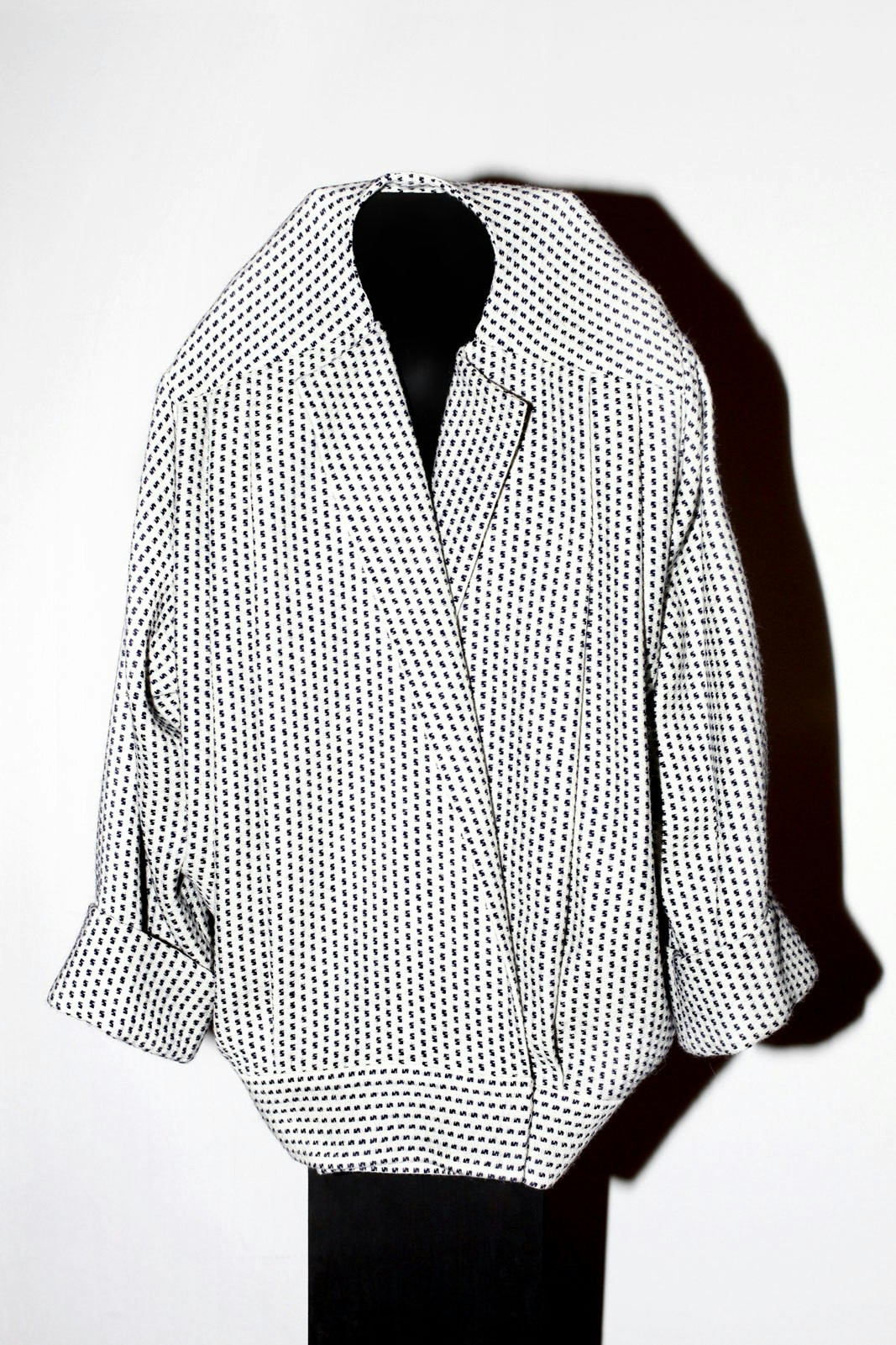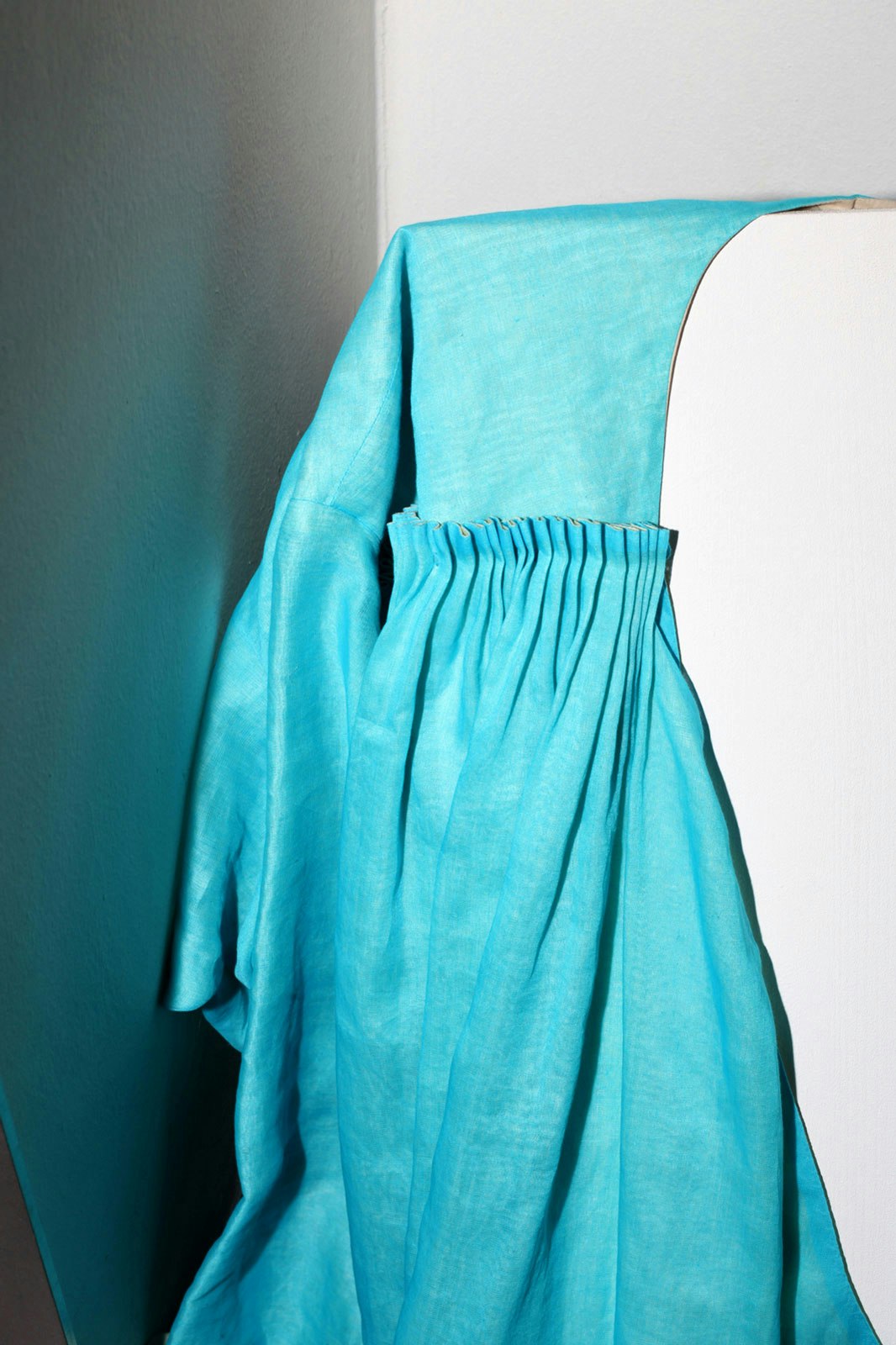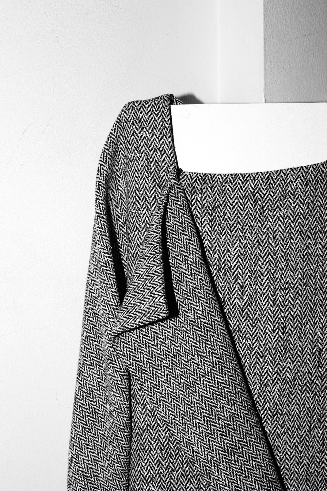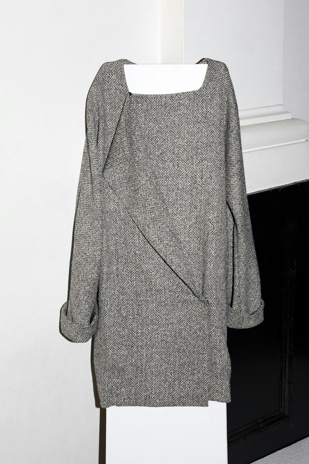 'Croisière 11' is based on three basic cuts and consists of 25 different looks. In the design process, the first cut was always a back to front movement, like a sweeping embrace. The fabrics are placed on the body from behind, with the spine as the starting point for the composition. An embrace is also the aspiration for how it should feel to wear these clothes. Almost all the pieces have an accentuated seam at the spine, which breaks up the flat surface of the back and permits an elongation of the wearer's silhouette. Side seams are largely absent. The front and rear view are generally geometrical in shape, whereas the sides play with volumes and bring a certain energy into the design.