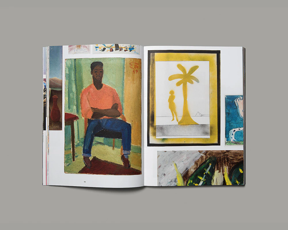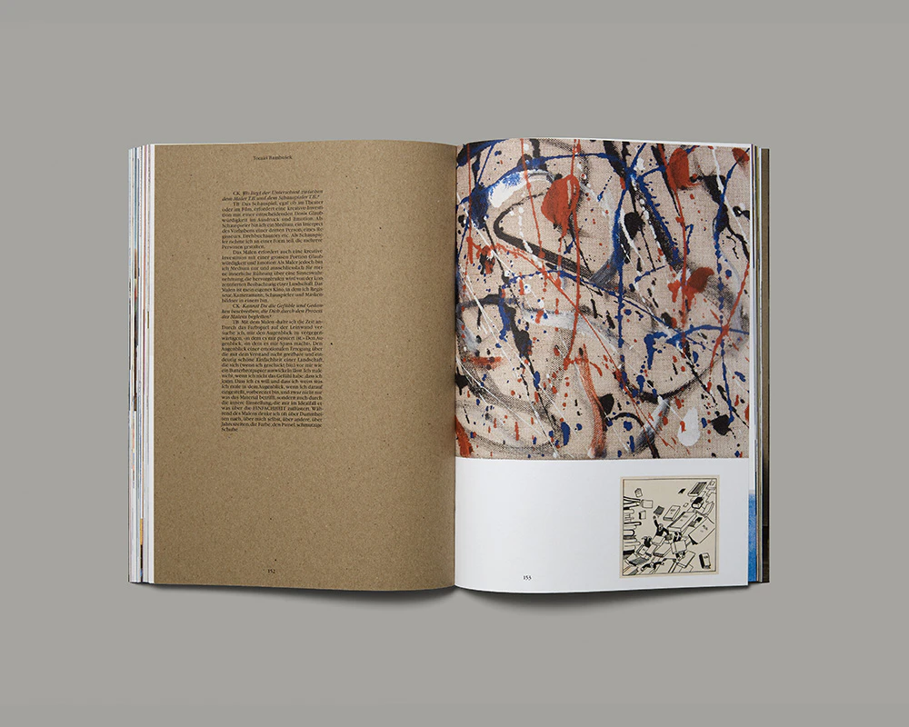 This unusual documentation of a private art collection focuses not on the individual works but rather on the activities of collecting and arranging. The grey cover with flaps and individual grey pages inside feature full-bleed, black-and-white photos of the walls and rooms of the collector’s house adorned with works of art. Further individual grey pages contain short texts. The bulk of the content consists of white double pages that transpose the spatiality of the collection into the book format by presenting images as if hung on walls: on each double page, between 5 and 50 works in four colours and various sizes are freely arranged. Most of the pages are filled to the edge, with numerous images drastically cropped and many running across the gutter. They are grouped together into topics somewhat distant from conventional scholarship. The topic names appear in the running headers and combine with the double pages of images to create an inspiring narrative. Freed from institutional constraints, the catalogue does not appraise the pictures according to their museum or commercial value; rather, the fitting contemporary design presents the undogmatic art lover’s approach in a favourable light.