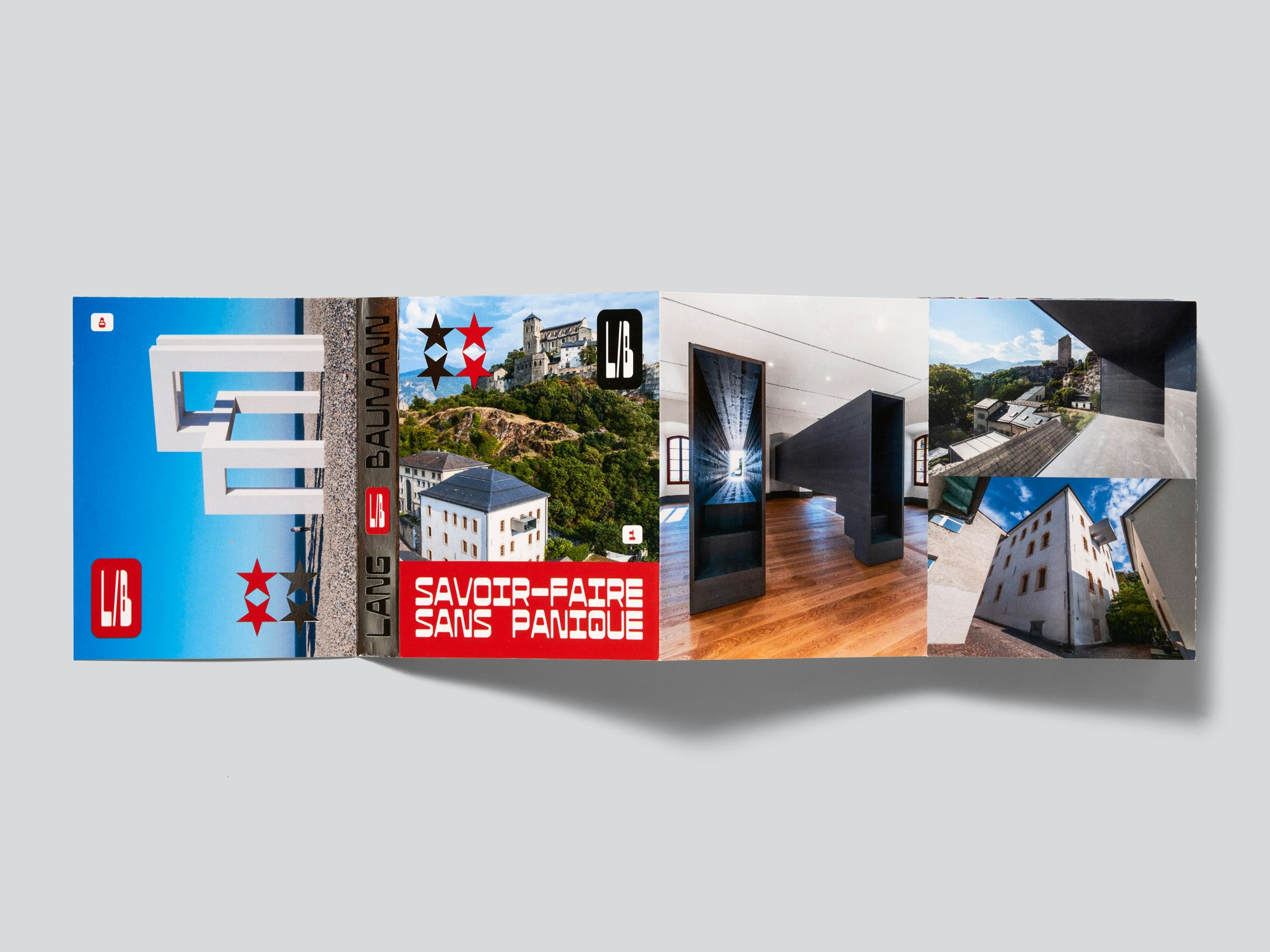 An exhibition catalogue from the Musée d’art du Valais in the form of a reduced-size postcard leporello inspired by tourist souvenirs compellingly presents the sprawling installations by Lang/Baumann. A total of 31 site-specific artworks in buildings or public spaces are shown across one to three pages of thin card in high-gloss photos ranging in size from small to miniscule and are arranged one next to another in a strict grid. Different perspectives on the works are accompanied by occasional pictures of their production and tourist snapshots taken on site by Lang/Baumann during their mounting. As the works span some ten years and ten countries, the book feels like a journey through the artists’ career. Design details such as a logo, a rudimentary monospace font with strongly inverted contrast used for titles and page numbers, and a silvery spine reinforce the book’s stylistic borrowings from a souvenir leporello. Overall, the unconventional form should not be seen as an ironic appropriation, but rather corresponds in many respects to the oeuvre. This is reflected not least in the precise production and model-like character of the leporello,in which all elements – including the tiny print in the picture index – appear to have been shrunk proportionally. This is reminiscent of the many models without which Lang/Baumann’s large-scale installations would be inconceivable.