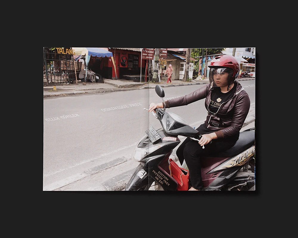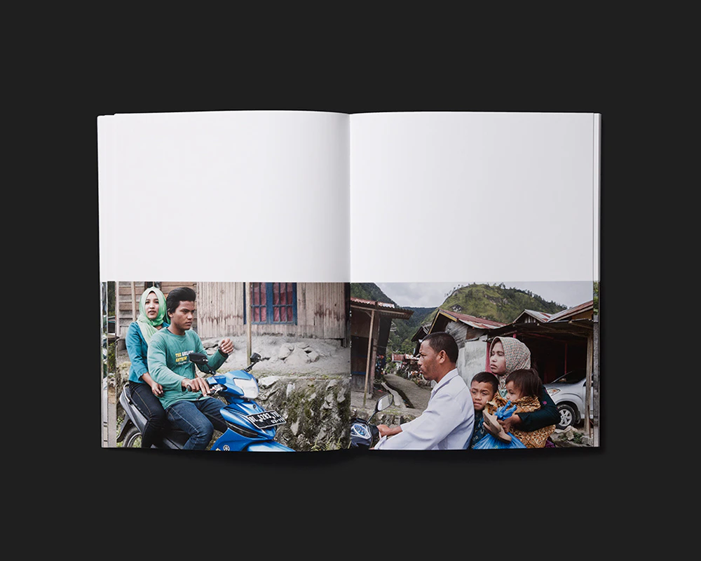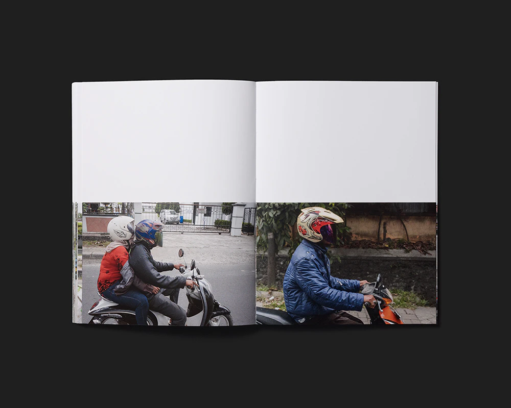 A small but comparatively thick and heavy volume of photographs presents quotidian and very repetitive snapshots depicting scooter riders on Sumatra going about their business. The design adopts an efficient approach to the candid genre: all the photos are positioned in the lower half of the page in full bleed, emphasising the linearity with which the captured moments succeed each other like the pages of a book when flicking through it. The linearity also evokes the road; and just as the scooters’ direction of travel sometimes switches back and forth, so the book allows for two directions of motion. Double-page photographs are printed on the softcover and endpaper. The embossed text is integrated into the cover picture, while the font evokes a street culture linked to the scooter. The large ISBN number on the spine emphasises that a book itself is assigned a moment in the linear temporality of the global book trade. Indeed the book’s content itself constitutes a snapshot, documenting everyday goings-on on Sumatra from the perspective of impartial observers.