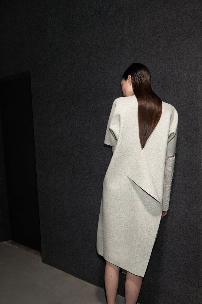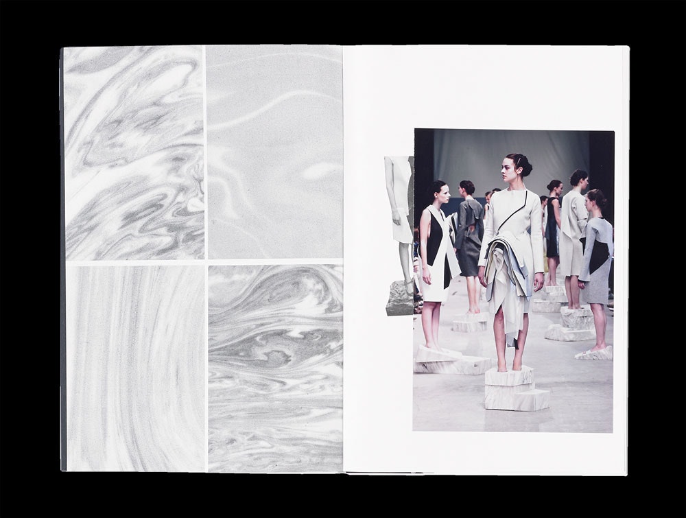 The result is a collection whose colour palette and fabric structure draws heavily on natural materials. The overlaying of the various fabrics and surfaces renders the clothes very rigid. Yet at the same time the collection is characterised by elegance and fluidity in the close-fitting garments. This tension between the flowing movements of the cuts and the rigidity of the material recalls the elegance of statues. The effect is enhanced by the method of presentation: at the end of the shows the models stand motionless on marble-like pedestals.