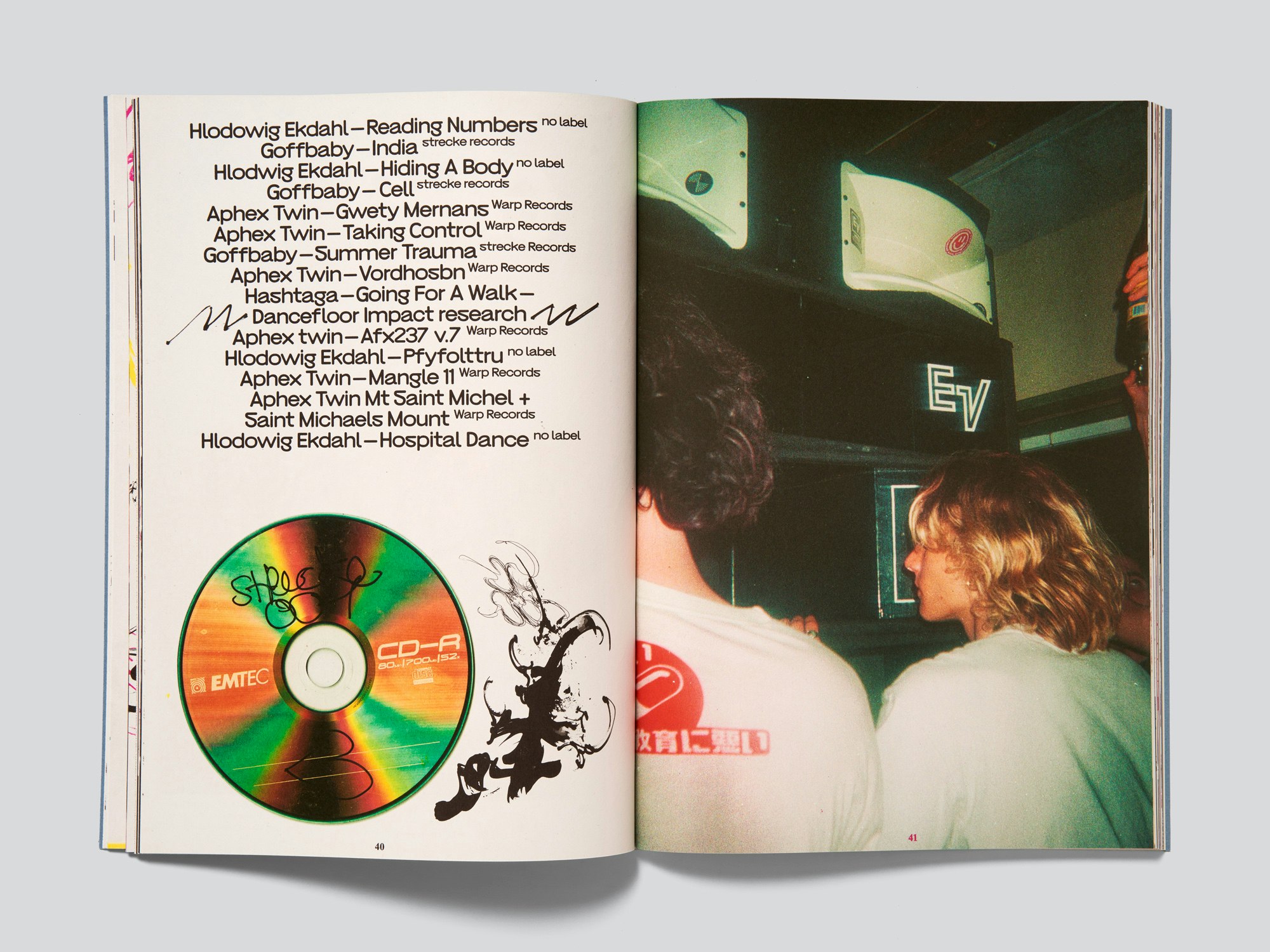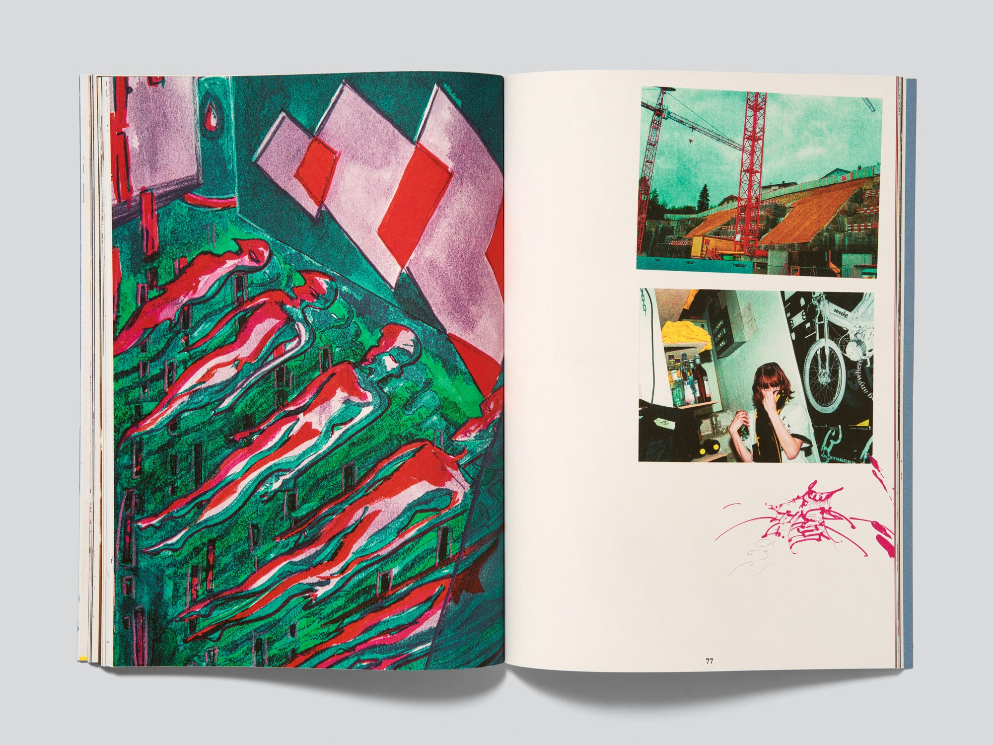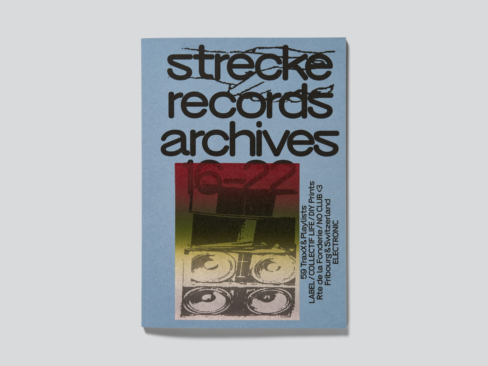 This 112-page, A4-format publication documenting the activities of the Fribourg music label and event collective strecke records (2016–22) is striking for its contemporary use of unusually strong colour tones and diverse visual elements, images, colours, text blocks and fonts. The design eschews a table of contents and an identifiable structure, instead freely playing with and combining photographs of concerts, parties and performances with record covers, flyers, playlists, and so on. Some pages have a clear layout, while others do not; the photographs are sometimes placed individually, but also alongside one another and occasionally rotated, cropped or collaged. This free layout follows a long tradition in the documentation of music scenes, compelling the reader to engage with curiosity, eager to discover the next twist in the improvisation, though occasionally contending with disorientation. The design also gives the publication a strong visual identity that ties together the disparate and, in some cases, not particularly high-quality material. One key element is the party playlists which reappear in different arrangements, set in a uniform size in strecke’s company typeface. A few pages at the beginning contain various short texts in a different font, placing the collective’s activities in a cultural-political context. The pronounced DIY ethos and the strong local ties also come across in the successful collaboration with a Fribourg-based printer.