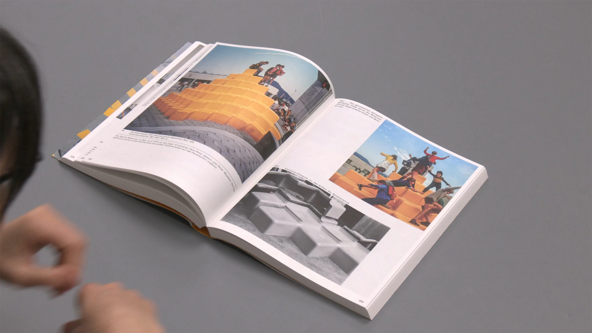 This catalogue with its understated design makes the extensive oeuvre of Susi Berger (1938–2019) and Ueli Berger (1937–2008) appear surprisingly light, doing an excellent job of bringing their works’ humorous undertone to the fore. The thin grey-and-yellow dust jacket with two flaps has an almost flimsy feel, but together with the rounded typeface and double yellow endpapers it creates a pleasing contrast to the harsh architectural grey that forms the context for most of the works depicted. Six essays and a dozen picture sections follow one another in non-hierarchical fashion but with a consistent layout, such that all points of the book draw equal attention. The picture sections focus on certain themes in the works, with each double page containing between two and five images of varying sizes and formats accompanied by informative captions. By systematically positioning all the images at the corners of the large print space, playful expanses of white space dominate the centre of the page. The different image types – sketches, plans, models, views of works, and so on – complement each other perfectly.