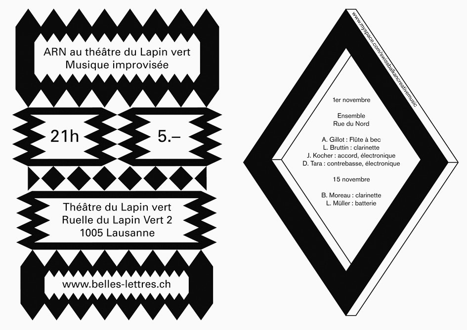 The posters, programmes and booklets for the experimental music venue Rue du Nord in Lausanne were created in collaboration with Mélodie Mousset. Throughout this series of commissioned works, published every two months, there is a central, recurrent graphic motif that makes their association with the venue instantly recognisable. By repeating the lozenge-shaped zigzag pattern in ever different configurations, Rihs not only ensures a high recognition factor, but also adds enormous versatility to the printed matter as a vehicle of information.