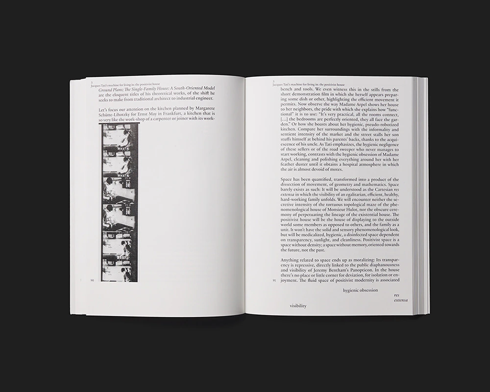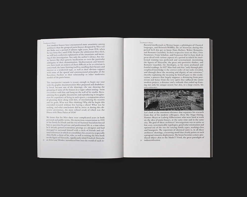 The illustrated analysis of seven real and fictional houses from the twentieth century published by the Spanish architect Iñaki Ábalos in 2001 reappears in a new edition with a fresh design. The stylistic means are explicitly contemporary – reduction to black and white, softcover with two images and page-size flaps, single-column main text in a relatively large font, and so on – but in this case they serve to underscore the work’s continuing relevance, indeed timelessness. The relatively small format is pleasingly modest for an architectural book. The chapters begin with a typographical title page followed by a number of large pictures, each on one page, and then the text. Smaller images aligned to the left are inserted into the type area in the middle of the paragraphs and sometimes in the middle of a sentence, so that they appear as integral parts of the whole. Chapter numbers and titles in the header, together with page numbers and one to four keywords at the bottom edge, frame each page and also provide a navigation system. The overall impression is light, elegant and attractive.