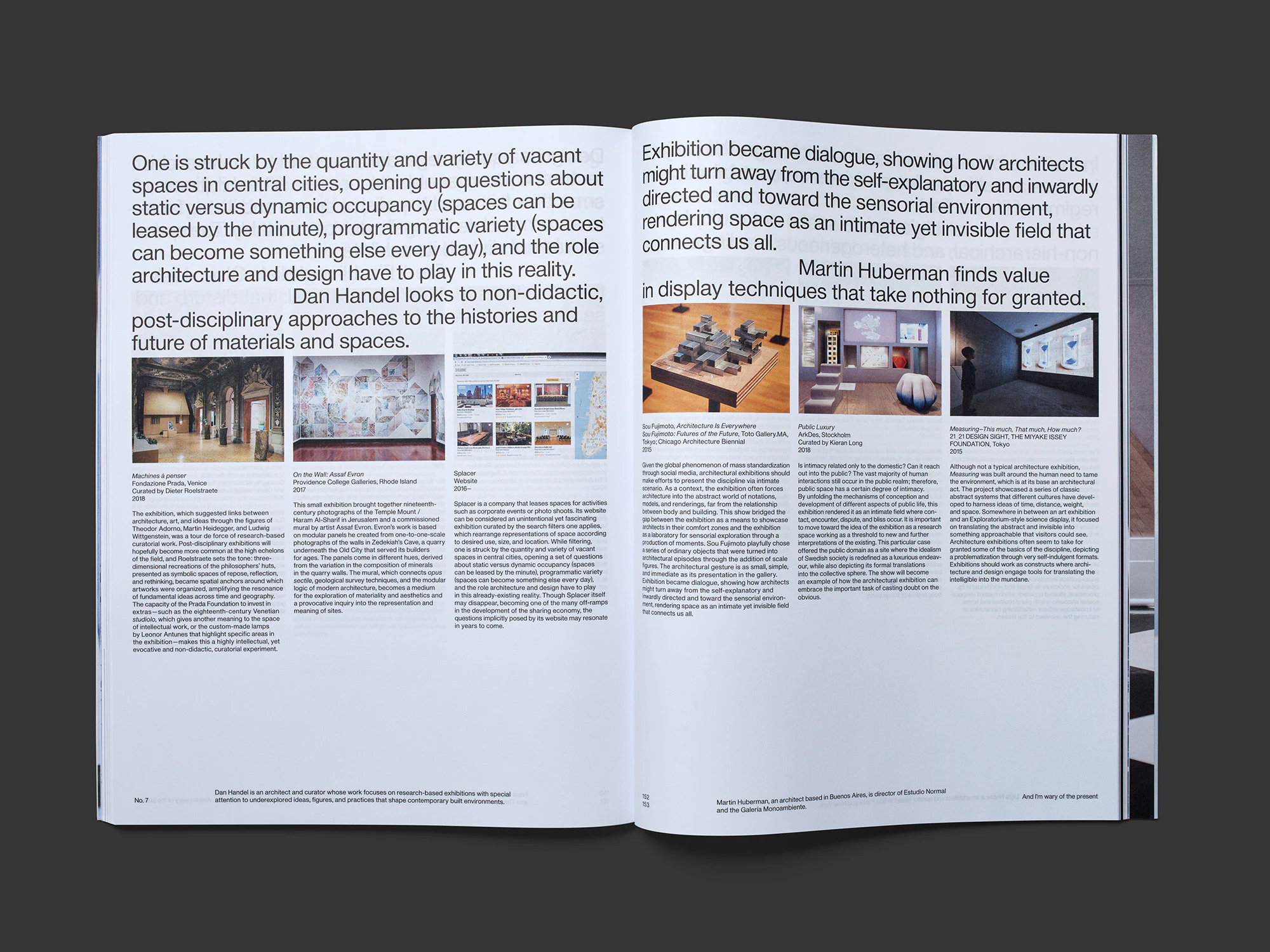 In this programmatic publication from the Canadian Centre for Architecture (CCA), which takes an entertainingly critical look at the role of the museum institution, the skilful and exquisitely crafted design assumes a leading function. A text divided into nine chapters, which runs through the book and in which the CCA speaks in the first person, is laid out in a single column in a large typeface, punctuated by individual images with detailed captions and generous areas of white. In between are numerous illustrated texts and interviews with some 30 curators from the international museum scene, presented in a small typeface and three-column grid. Overall, the design ensures that the theoretical explanations come across not as arrogant but rather as accessible and even human. This is a genuinely novel way of serving up information that is very open, fluent and generous. The result is a fantastic reading experience enabled by a designer who has mastered every aspect of his craft and presents the material in the best possible way.