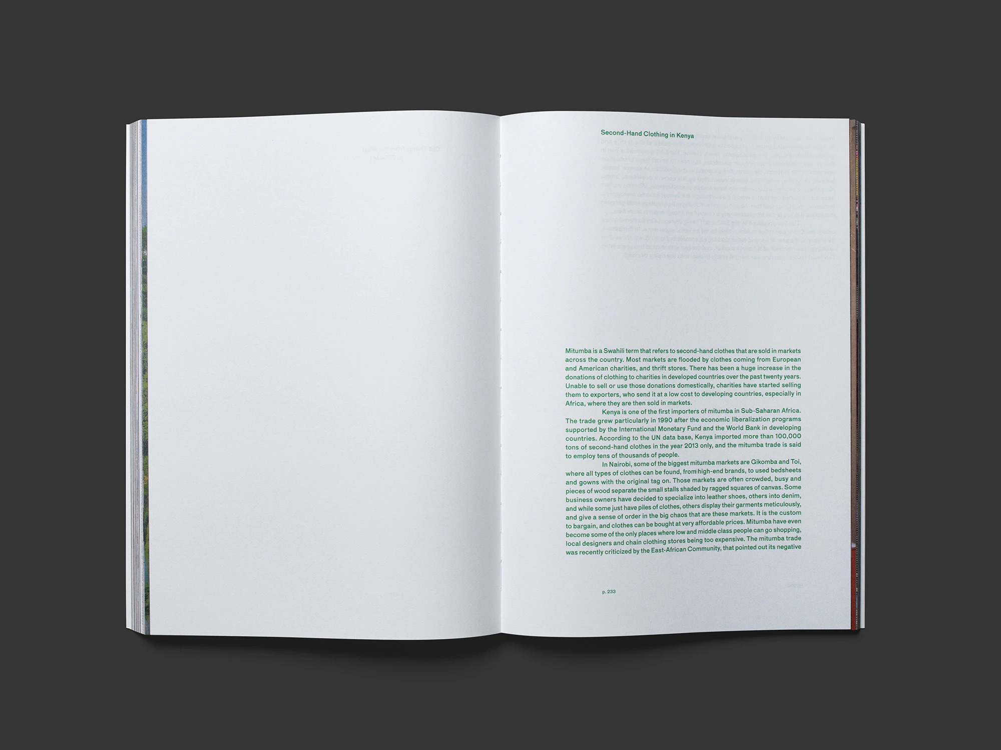 This large and colourful photo book offers inspiring insights into a fashion consciousness – seemingly at once alien and familiar – that has recently grown up among the younger population in Kenya. Some 300 photographs taken by the duo of designers during two research trips are almost all printed full-bleed on a page and often arranged into double pages. Fashion images are combined with interiors of garment factories, still lifes and travel impressions. Some of the pictures are strikingly rasterised while others are collaged, yet the result is nevertheless an aesthetic unity. The pictorial material is thematically subdivided into three chapters documenting three sectors of the clothing market in Kenya that exist side by side: up-and-coming local industry, imports of clothes from Asian countries, and the second-hand repurposing of clothes from Western industrialised nations. At the end of each chapter is an index containing detailed explanations of the individual photographs in a restrained design that complements the opulent visual festivity of the clothes with extensive background information. Everything about the book is surprising and extremely vibrant, and it presents the way the people view themselves rather than the perspective of an outsider.