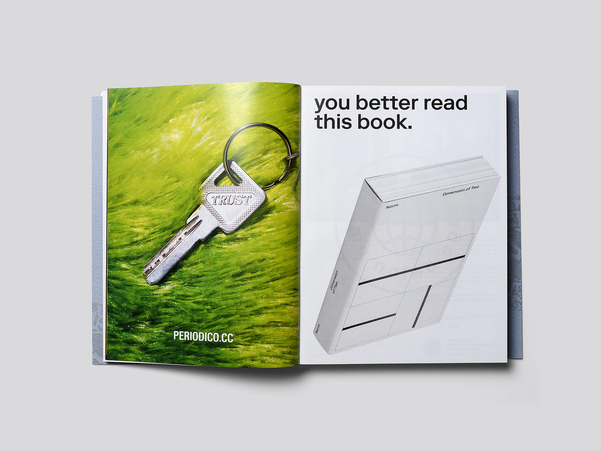 A medium-format, relatively thick book by the Zurich artist duo Veli & Amos adeptly tackles the current production conditions of art in general and art books in particular. The first 60 or so high-gloss pages are filled with full-bleed advertisements for local small businesses from the creative industries and associated sectors. Selling the pages was part of the plan for funding the book, and it is a continuation of the artistic practice documented later on, in which Veli & Amos spent more than three years constructing a poster wall on the roof of the Zurich gallery building Perla-Mode and rented it out as advertising space (painted, if required). More than 100 ads that were displayed there are documented in a landscape photo each, rotated through 90 degrees and placed on a right-hand page of the book. The pages are cut from a firm poster paper with a special reverse side on which the dates and the artists executing the advertisement are detailed. At the end is a short ‘making of’ section, with an explanatory text and photos of the painting work. The Arial typeface used throughout, which was made popular by Microsoft but is regarded as deficient from a design perspective, references non-professional graphics such as small ads and business cards. This is a piece of local art history in an almost classical yet subtly adapted book form.