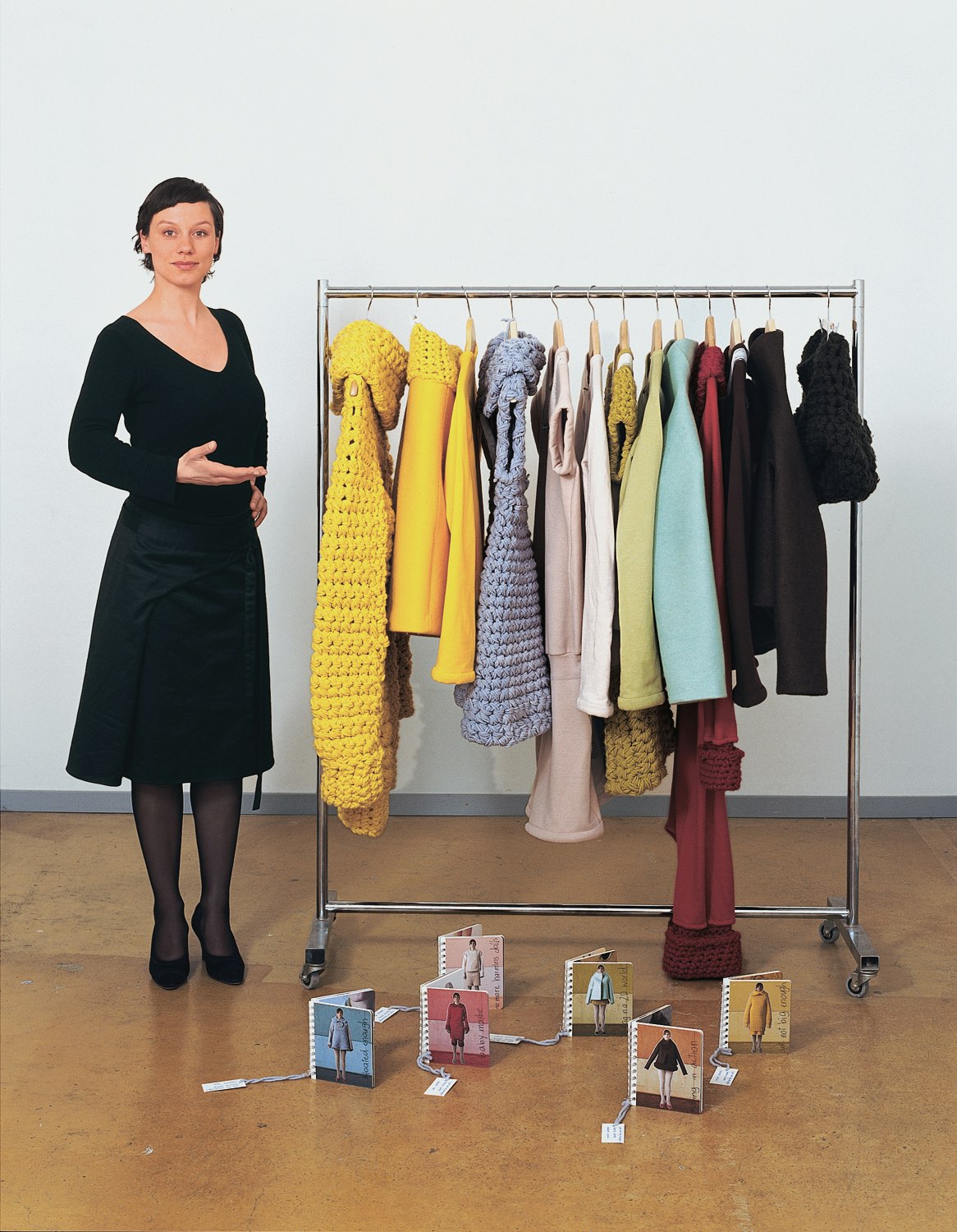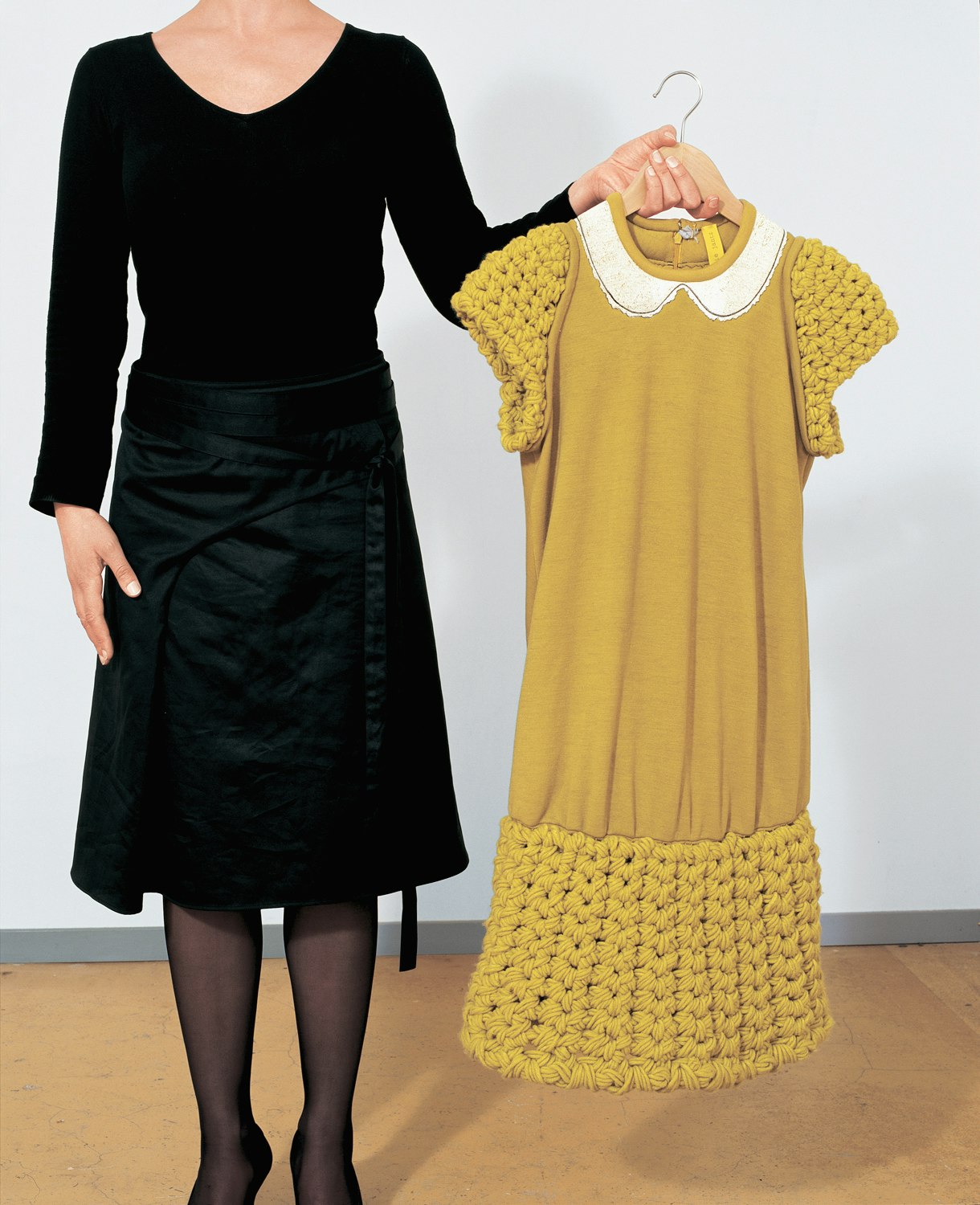 Inspired by the Japanese artist Yoshitomo Nara and his creature that fluctuates between child-like cuteness and invidious monstrosity, Valerie Jantz uses the six outfits of her diploma project ‘just not big enough' as a means of seduction into another world, a world of capricious dimensions, shifted proportions and ambivalent feelings. The clear colours and firmness of the thick industrial felt, the large sewn padded buttons and collars, and the over-sized stitches of the quadruply crocheted wool make these outfits look more like objects than items of clothing. The bodies of the women wearing them, ‘packed' into these pieces, change proportions, become immobile in a doll-like manner and suddenly appear to be uniquely fragile. With consistent clarity and a convincing presence, Valerie Jantz implements her idea and presents a collection, which is impressive in the autonomy of the implementation of the basic idea, an idea with a great ability to irritate.