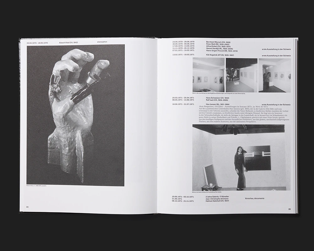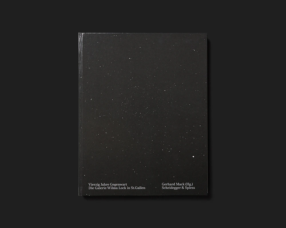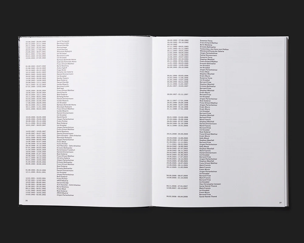 This volume marking 40 years of Wilma Lock’s gallery employs an efficient system of organisation and design. An interview with the gallery owner in the typeface Media77 is followed by four pages containing a chronological list of all the exhibitions, mostly on one line, in relatively bold Unica77. The same listing in an identical composition reappears sporadically over the 150 pages that follow, but this time the lines act as cross-headings. In between are short newspaper texts (again in Media77) and / or documentary photos. The texts are arranged one below another in a single column, but the images vary in number, size and positioning in accordance with a pared-down system. Thus while the rhythm changes, everything remains extremely controlled. The lithography and printing are of superior quality. The two fonts of Team77 recall the year of the gallery’s foundation and underscore typographically the claim of 40 years of enduring relevance formulated in the title.