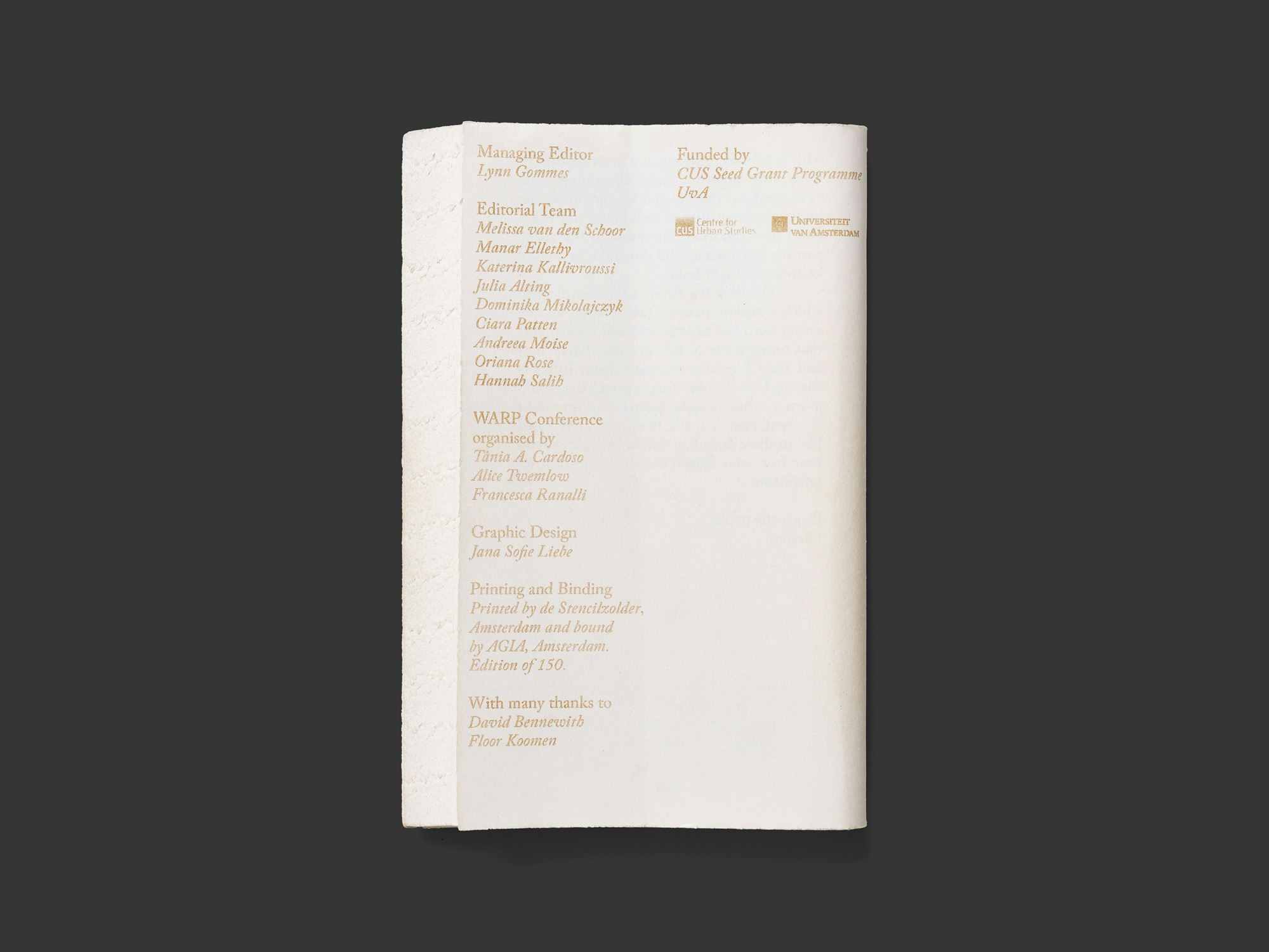 This anthology on an Amsterdam conference on the topic of ’walking as research practice’ is a very easy-to-handle softback book on light-grey paper, constructed in a novel and surprising way. The book block has no cover and is glued using a binding gauze, allowing the pages to be refolded entirely as the reader wishes. It can always be held easily in one hand. The texts remain fully and clearly readable, as they appear in a relatively large serif typeface and only on the right-hand pages. This construction is every bit as functional as it is elaborate. It also links directly to the theme of the conference in that it allows the book to be held in one hand and enjoyed while walking. Additional elements – footnotes, bibliographical details and a few pictures – are placed on some of the left-hand pages, printed in gold. Blank pages reserved for notes underscore that this is in many respects a book for active readers. Everything is straightforward, clear and self-assured.