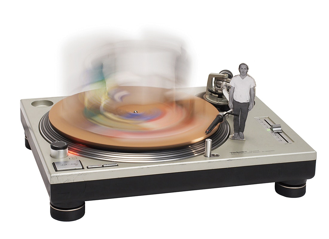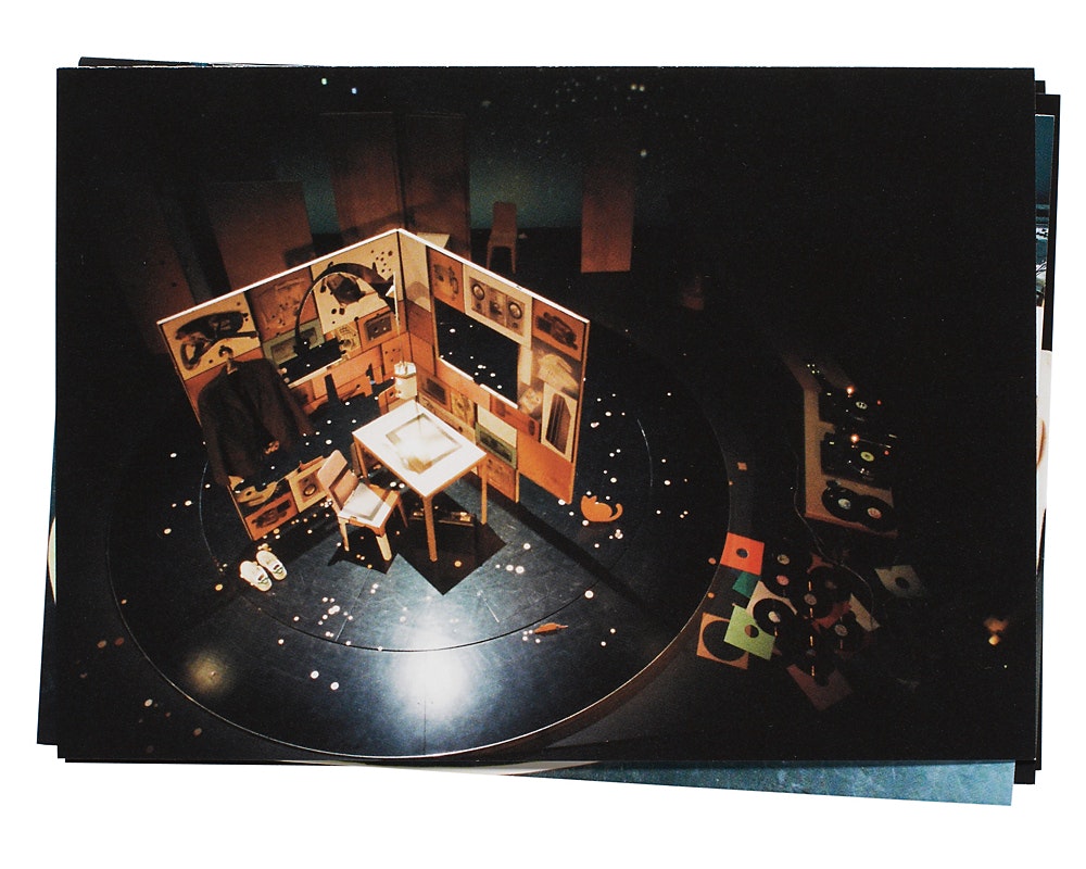 The current show 'Gaff Aff' is set on a small stage shaped like an oversized record player. The character (Martin Zimmermann), looking neat in his suit, carrying his briefcase, mimes the trials and tribulations of modern life. From the backdrop, a packing box with mass consumption items printed on it, he pulls out all sorts of things: a folding chair with a chair, a lamp and a coat-hanger, creating a small, intimate living space. That character, moving to the rhythm of the music and then flitting between mobile phone and television set seems on the verge of madness one minute and completely calm the next.