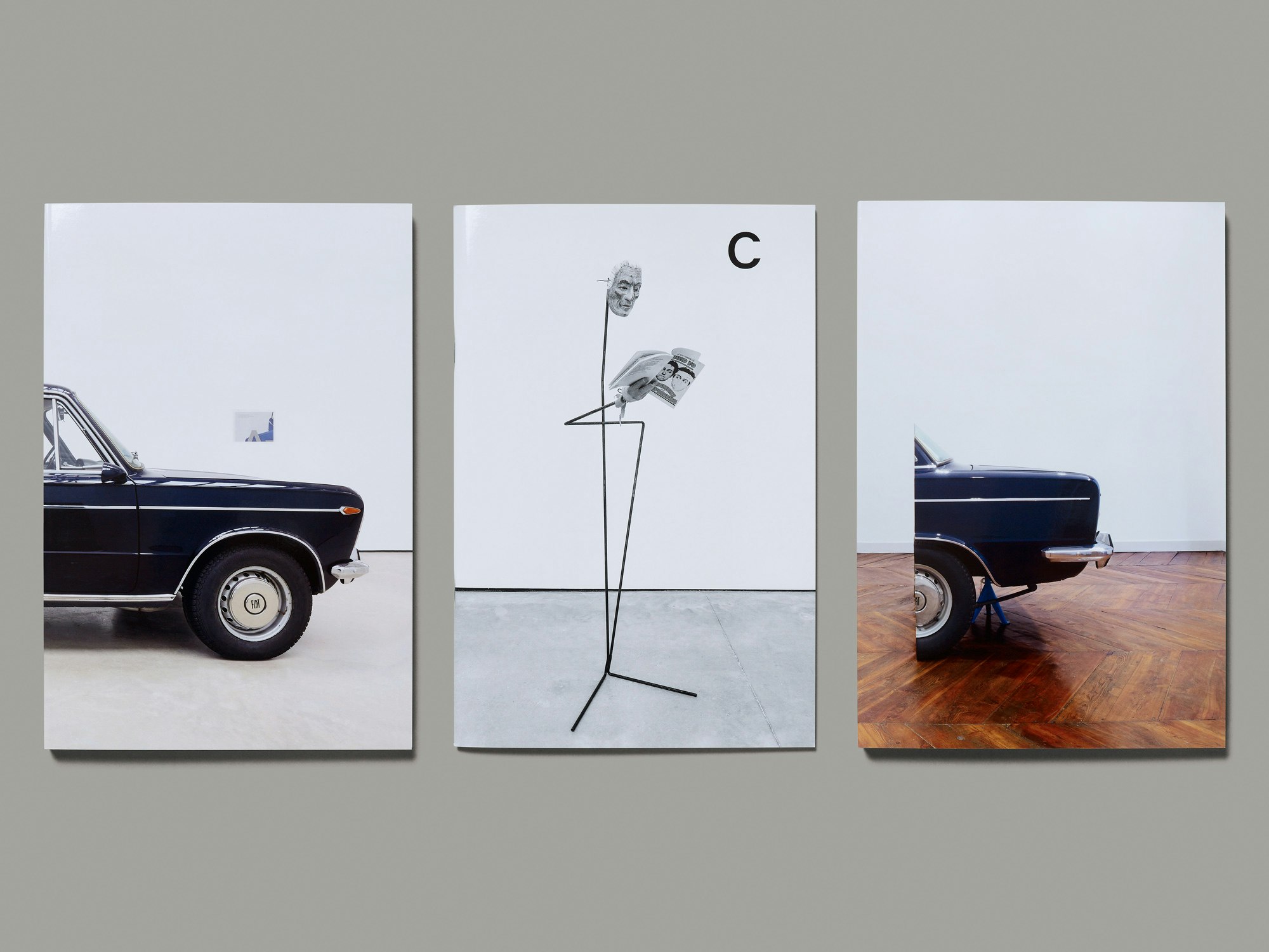 Ce lourd catalogue en trois volumes, sous coffret en carton gris, constitue une adaptation graphique au format livre de l’art conceptuel de Simon Starling, pour devenir un objet plastique à part entière. L’installation de l’artiste était consacrée à un tableau de grand format de Tiepolo (1696–1770) coupé au début du XIXe siècle en deux parties inégales aujourd’hui conservées respectivement à Édimbourg et à Turin (collection Agnelli). Lors des expositions à Glasgow et à Turin, Simon Starling avait montré une reproduction au format 1/1 de la partie manquante du tableau ainsi que le segment d’une Fiat 125 (le modèle préféré de Giovanni Agnelli) découpée selon le même rapport. Deux volumes du catalogue sont consacrés chacun à une des parties du tableau. Elles ont été redécoupées en plusieurs fragments, qui sont reproduits sur une partie des pages. Les autres pages sont blanches et correspondent aux parties manquantes du tableau. Les couvertures montrent les reproductions des parties de la Fiat et les pages de garde portent un petit schéma qui illustre comment recomposer le tableau avec les pages du livre. Et c’est tout. Il n’y a aucun texte, aucune légende, aucun folio, seulement les reproductions d’une peinture, découpées et reliées à la suisse. Le troisième volume est une fine brochure à la couverture noir et blanc qui rassemble toutes les informations relatives à l’oeuvre. Le geste performatif est réussi et même si l’objet fera le bonheur des collectionneurs bibliophiles, il n’est pas simplement décoratif pour autant ; il possède au contraire une identité bien marquée et un caractère ludique. Qu’est-ce qu’un livre ? Cette question ancestrale trouve ici une réponse pour le moins inattendue.