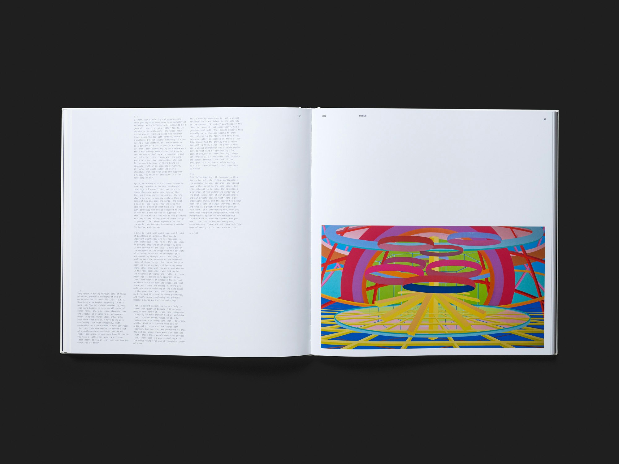 Dans ce vaste catalogue au format carré consacré au peintre new-yorkais Al Held (1928–2005), un graphisme très affirmé mais jamais écrasant noue un dialogue fertile avec des tableaux majoritairement géométriques. En faisant communiquer les lettres du titre avec certaines formes du tableau reproduit, la fabuleuse couverture rigide montre d’entrée de jeu comment la typographie répond au langage visuel de l’artiste. Les très grands numéros romains qui, placés sur le bord droit des pages, ouvrent les quatre chapitres de texte sont un autre exemple de ce dialogue. Le travail iconographique est excellent et, comme les textes sont dispersés à travers le livre, la traditionnelle séparation entre une partie texte et une partie images s’efface au profit d’un tissu narratif très dense qui offre une introduction à la carrière du peintre. L’utilisation de deux papiers très différents, un blanc glacé et un mat légèrement jaune, rappelle le travail important que Held mène sur les différentes nuances de blanc. Il est remarquable qu’une mise en page aussi précise et soucieuse du moindre détail ait pu trouver sa place au sein des processus de production d’une grande galerie d’art commerciale. La typologie du beau livre est respectée mais elle est mise en forme d’une manière tout à fait singulière.