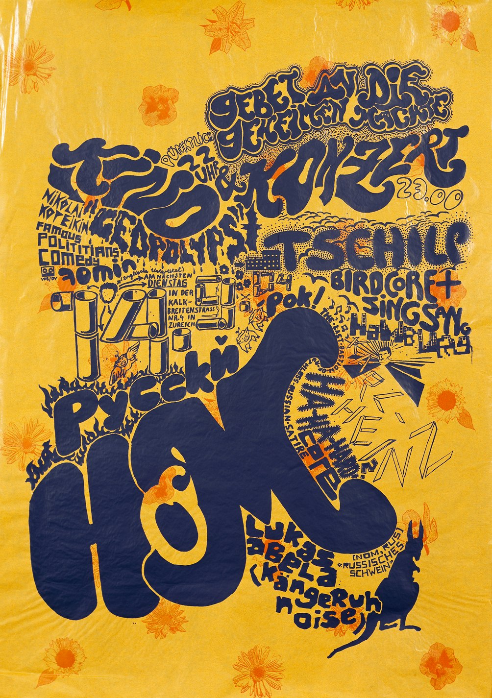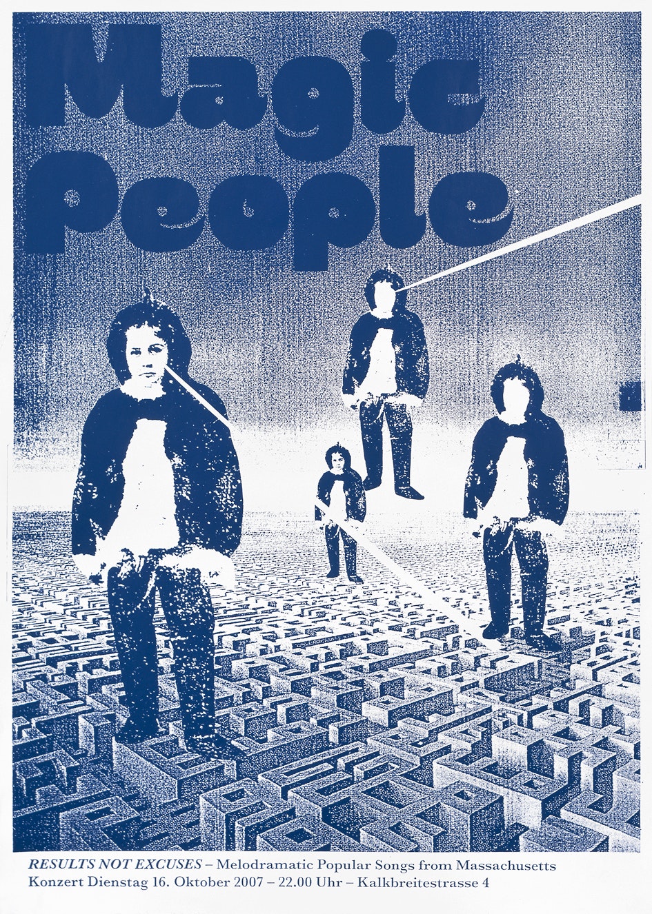 Pour l'affiche d'une soirée de concert, elle a tour à tour agrandi et photocopié une photo de plateau jusqu'à obtenir le tramage grossier qu'elle recherchait. Bien qu'elle ait choisi un caractère et une composition plutôt classiques, en colorant l'image et le lettrage d'un cyan soutenu, elle donne à cette affiche de format A2 une allure très contemporaine.