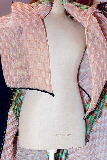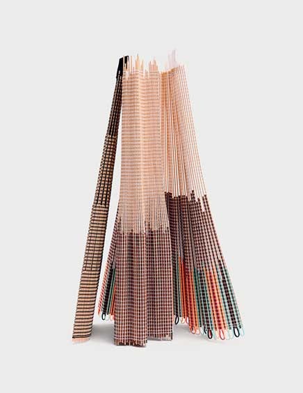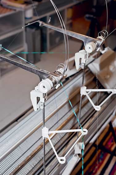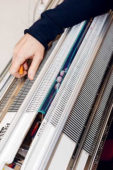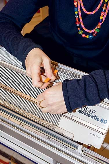 Comment Cécile Feilchenfeldt est-elle venue à la maille ? « Dans mon cœur je suis plutôt tisserande mais la maille est une autre langue, très mathématique, qui me correspond aussi. Le tissage est plus méditatif : un fil se rajoute à beaucoup d'autres fils. On voit ce que l'on fait : c'est plus sécurisant. La maille, c'est un seul fil qui tient tout. Et le travail que l'on fait disparaît dans deux fentes : pendant 20 centimètres, on ne voit rien ! Puis un petit bout apparaît dans l'ombre. » Le tricot étant tendu par des poids, la troisième dimension n'apparaît que lorsque le travail est terminé. Lorsque la machine a libéré l'objet tricoté. « C'est à ce moment que je découvre ce que j'ai fait », dit-elle. Il y a donc une merveilleuse part d'aléatoire dans le travail de Cécile Feilchenfeldt. « Mes journées sont remplies de surprises : des bonnes comme des mauvaises. La maille est très vivante. » D'où les surprises, donc.