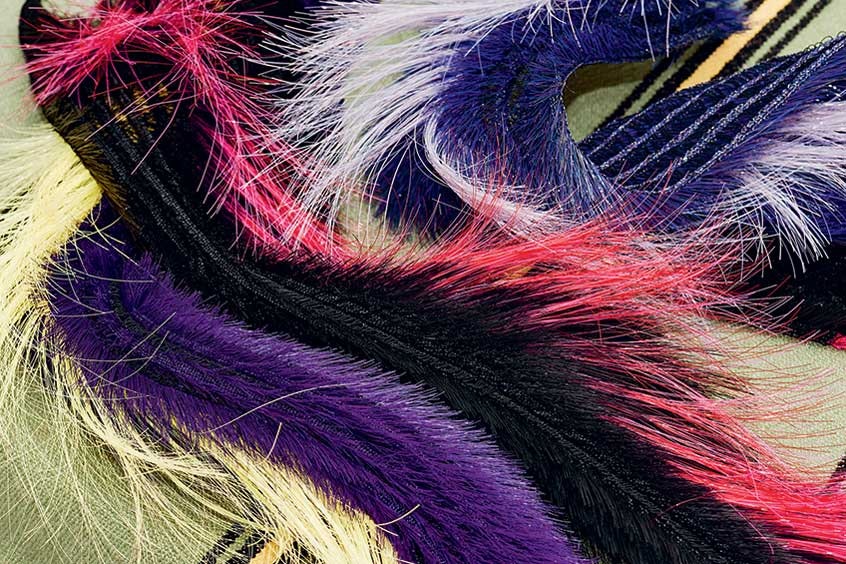 Cécile Feilchenfeldt montre des échantillons de matière tricotée, dont un volant de nylon dans lesquels sont intégrées des perles. Je me souviens les avoir vus, ces volants aux couleurs arc-en-ciel pendant la semaine de la haute couture à Paris. C'était en regardant défiler la dernière collection haute couture Schiaparelli dessinée par Bertrand Guyon. Il y a quelque chose de gratifiant dans l'idée que son travail est sa signature, même si les maisons ne mentionnent pas toutes son nom. A part Lutz Huelle et Walter van Beirendonck. Mais je les reconnais ses tricots d'un autre monde : il y a les tricots de nylon, de raphia, de bois, il y a ces couleurs qui se mêlent, ces envolées, ces sculptures mouvantes ...
