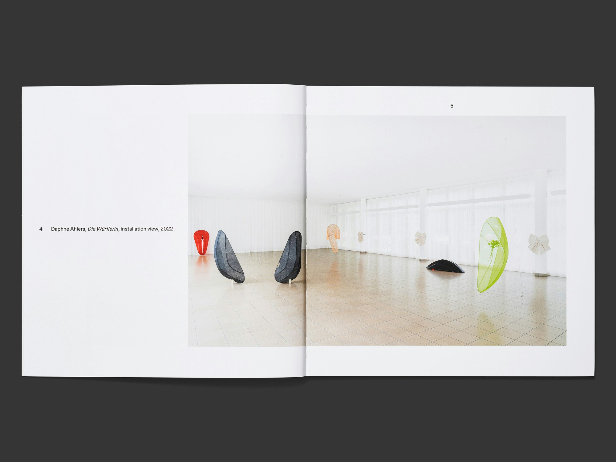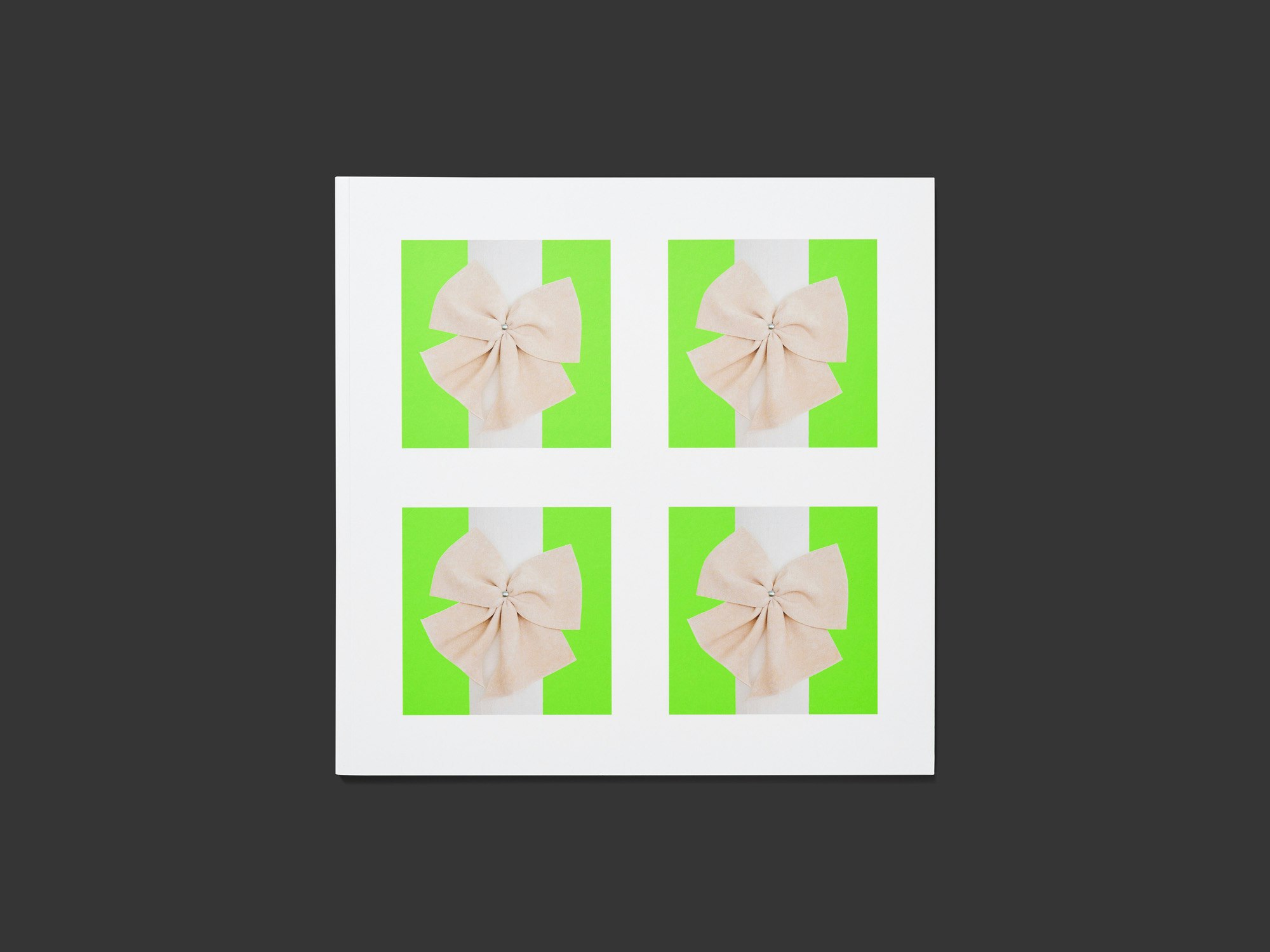 Le catalogue carré, très fin, de l’artiste hambourgeoise Daphne Ahlers montre différentes formes de sculptures qui, grâce à un agencement raffiné, interrogent les modes de présentation des oeuvres d’art et les mécanismes de valorisation des objets. Une impression de mystère se dégage au premier abord : le corps d’ouvrage blanc, avec l’image d’un noeud de ruban blanc sur fond vert reproduite quatre fois en couverture et ses deux tranches vertes, fait penser à un emballage cadeau. Quelques vues d’exposition, reproduites sur des doubles pages et encadrées d’un large bord blanc, montrent les sculptures textiles délicates d’Ahlers. Un essai composé sur une colonne relativement large avec une police sans empattement est suivi d’une série de petits objets muraux photographiés seuls et toujours sous le même angle frontal, comme s’il s’agissait de bijoux. Les images sont disposées selon deux grilles simples qui se succèdent en alternance régulière, tandis que se détache un élément typographique, la pagination, qui change continuellement de place. La mise en scène luxueuse contraste avec le papier relativement rigide et la couverture en carton évoque plutôt un produit bon marché. Le catalogue rappelle de loin les livres d’art des années 1970 mais sous une forme renouvelée, contemporaine.