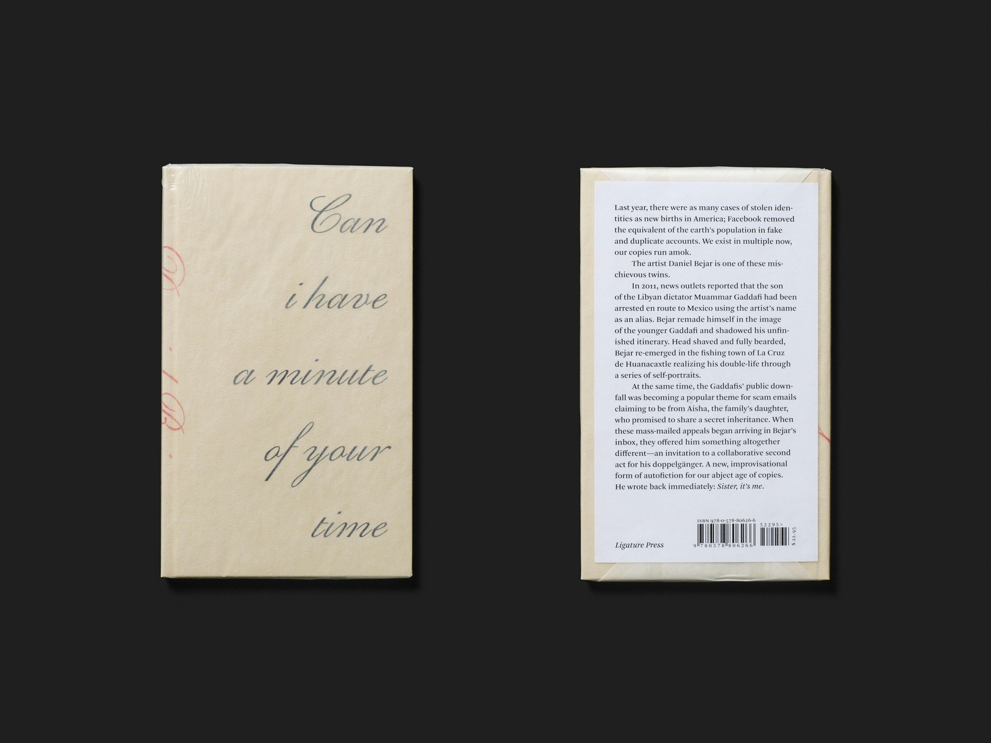 Un petit volume de textes de l’artiste états-unien Daniel Bejar, fin et à la couverture rigide beige, met en scène un jeu graphique truffé de pièges autour de la question de l’usurpation d’identité et d’arnaques en ligne. L’ouvrage est difficile à catégoriser à première vue. On pense éventuellement à un roman épistolaire, et l’écriture calligraphiée suggère même une correspondance amoureuse. Il s’agit en réalité d’un échange de courriels entre Daniel Bejar et des escrocs anonymes se faisant passer pour Aïcha Kadhafi – la fille du dirigeant libyen tué en 2011. Sollicité pour contribuer financièrement à débloquer un compte bancaire orphelin richement garni, l’artiste répond en signant « Saadi Kadhafi », le frère d’Aïcha, qui avait vainement essayé en 2011 d’entrer illégalement au Mexique sous le nom de Daniel Bejar. S’engage alors un échange de courriels profondément absurde qui est reproduit ici avec beaucoup d’espace blanc sur 150 pages. De petits papiers volants, reproduisant des publicités en ligne criardes, sont glissés entre certaines pages. À l’instar d’une fenêtre pop-up intempestive, ils exigent une interaction immédiate : les mettre de côté ou les jeter. Comme procédé graphique, l’utilisation de ce type d’inserts a souvent quelque chose d’un peu poussif mais ici, elle fonctionne parce qu’elle s’accorde avec le sujet et qu’elle souligne en outre la démarche humoristique du livre. La mise en page se contente de quelques choix rares mais précis.