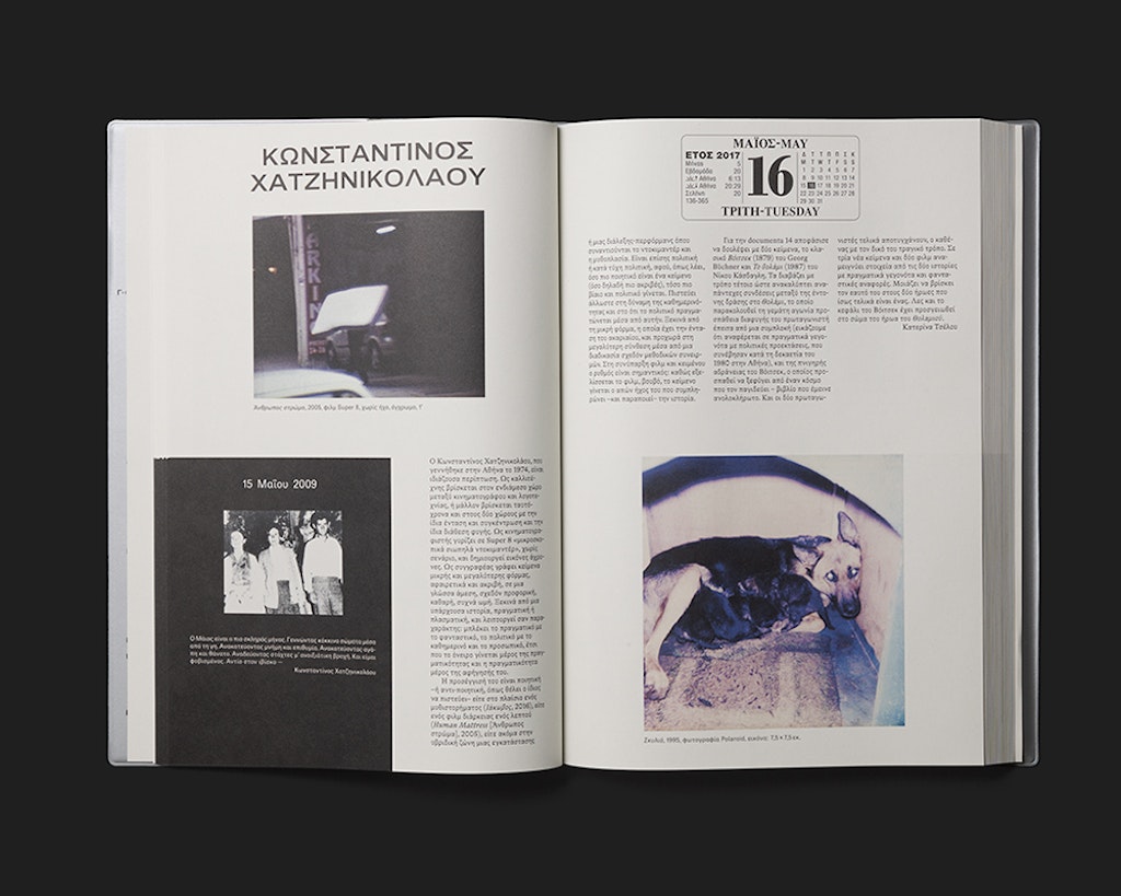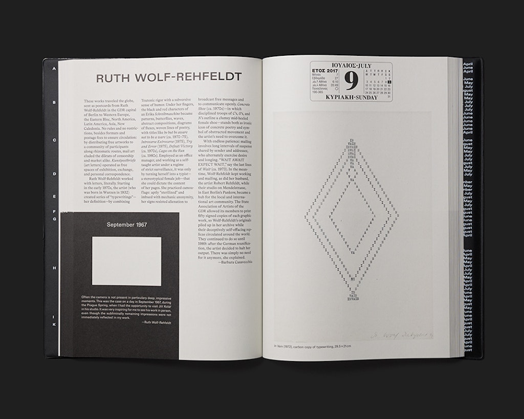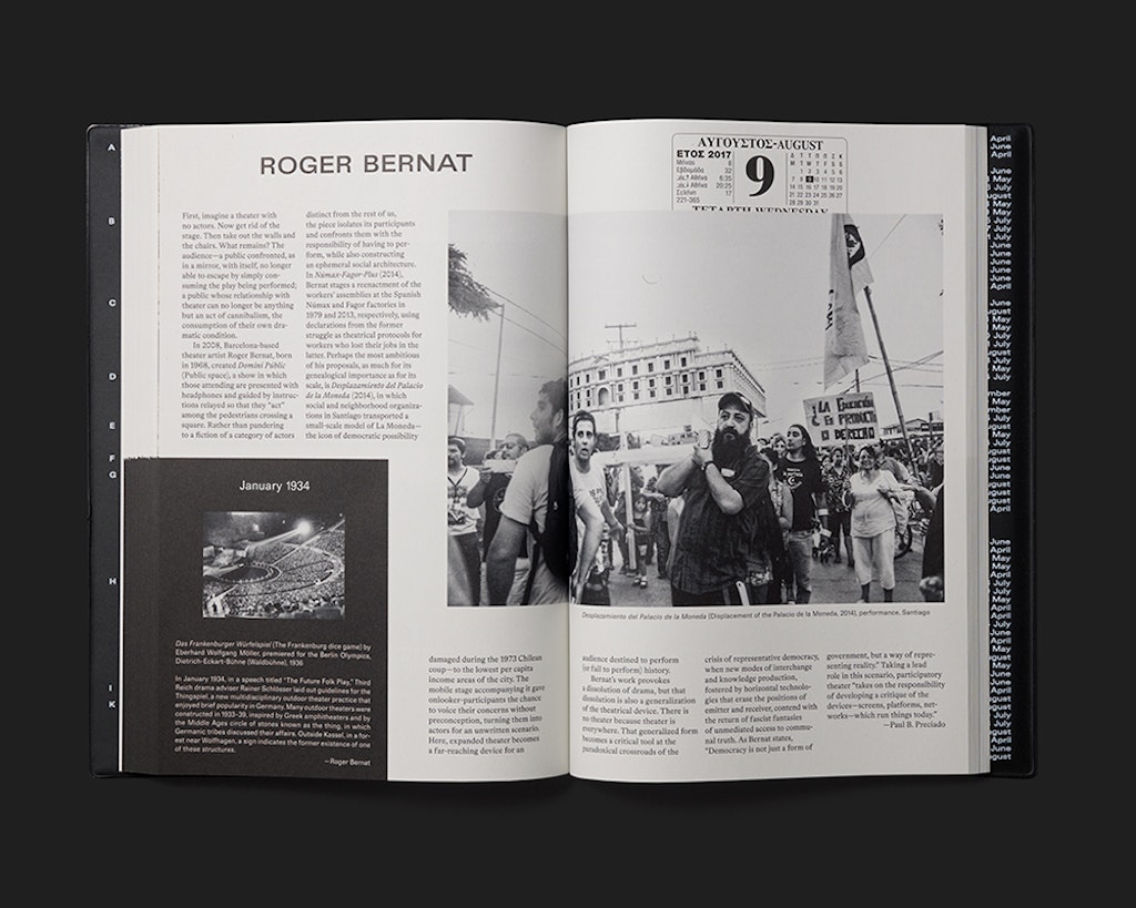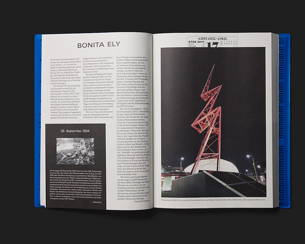 Le guide de l’exposition documenta 14 est fondé sur une chronologie double qui présente, avec davantage de complexité, l’« ici et maintenant » de la contemplation de l’art. D’une part, la durée de l’exposition se reflète dans le temps qu’il faut pour lire l’ouvrage. La numérotation des pages prend la forme d’un calendrier qui égrène, en haut des pages de droite les jours d’ouverture de documenta 14, le nombre de doubles pages du catalogue correspondant au nombre de jours d’exposition. D’autre part, tous les artistes participants – dont chacun est présenté sur une double page en images et en texte – ont été invités à mentionner une date historique servant de référent à leur travail. Cette deuxième date apparaît en titre de l’encadré noir toujours identique en bas de la page de gauche qui présente une petite illustration et un bref texte. Classées selon une chronologie à rebours, ces dates déterminent l’ordre de présentation des artistes. La conception graphique, très élaborée, ajoute une plus-value à l’exposition tout en créant une atmosphère qui lui est propre. Une préface intitulée « Dear Reader » explicite le concept graphique et introduit le lecteur au livre.