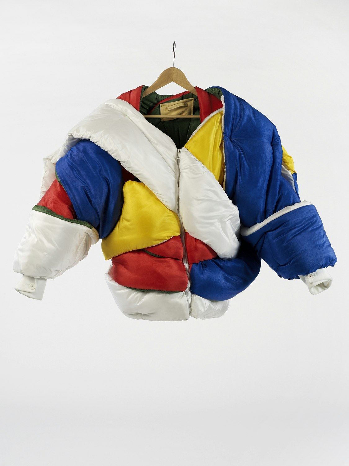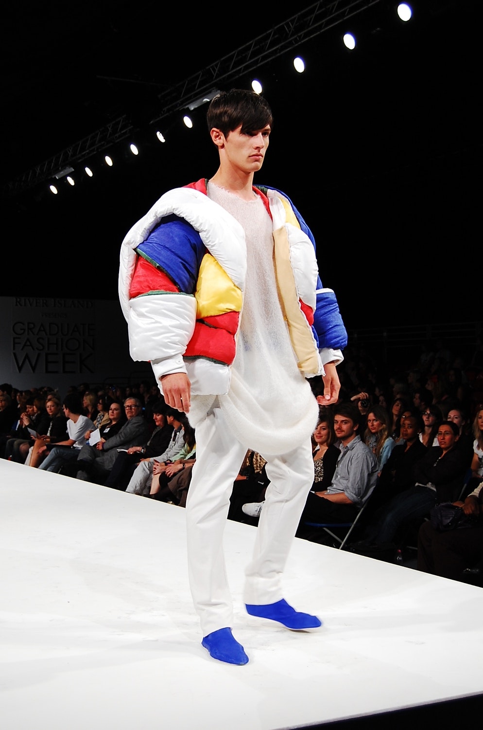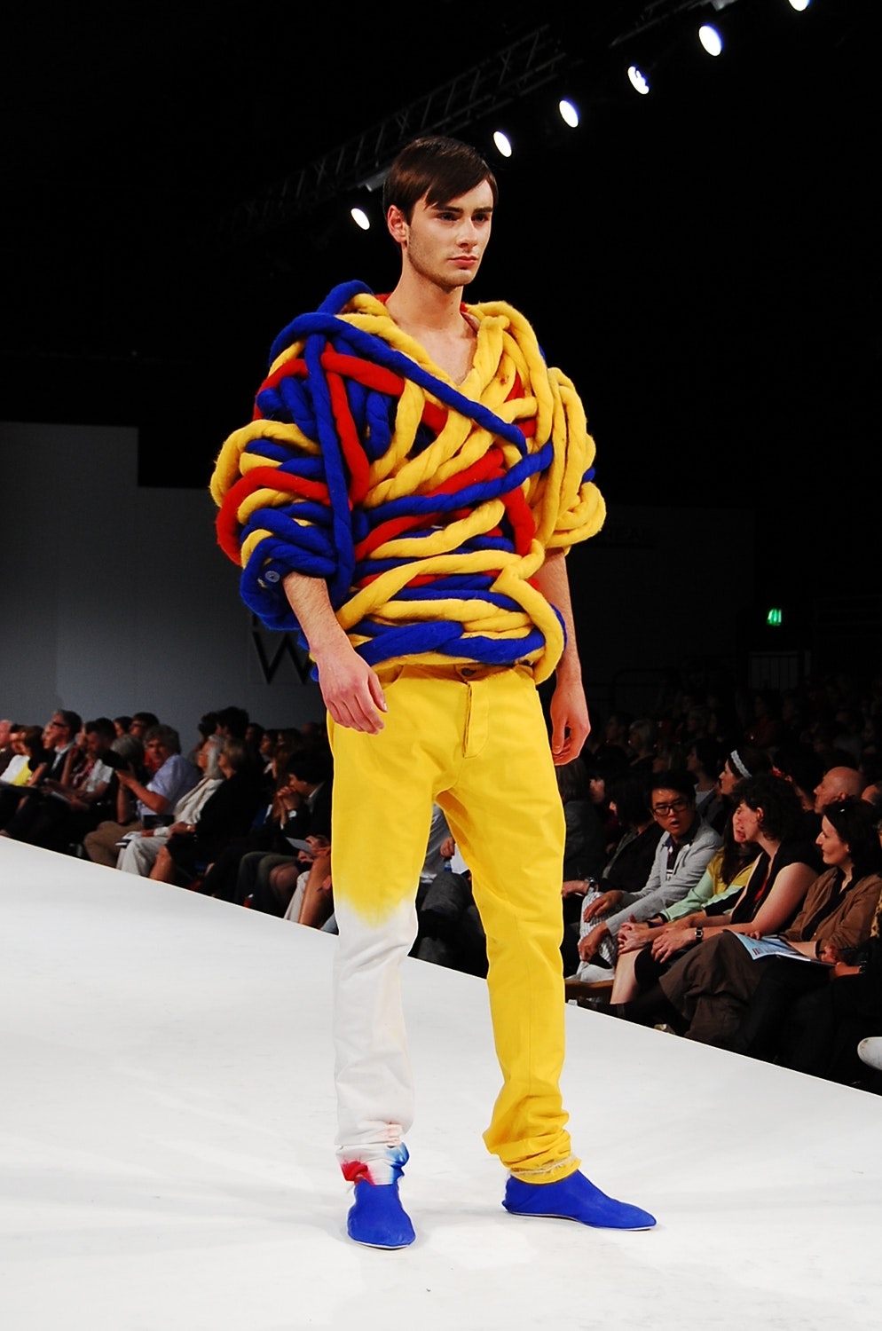 Comment parvenir à se positionner lorsqu'on est un jeune styliste de mode masculine? Il s'agit là d'un sujet épineux, car les hommes, ces 'maîtres de la création', sont connus pour leur conformisme et la modération de leurs goûts. Dominic Knecht surprend avec une flamboyante collection de vingt modèles, dessinée pour son travail de bachelor à la Hochschule für Gestaltung und Kunst de Bâle (FHNW). C'est d'abord l'expression courageuse d'un point de vue et un témoignage de sa passion pour les expériences. Le nom de la collection commence par un 'Do not construct the fashion...' pour se terminer par un intrépide: '...let the fashion construct itself'. Le postulat de Dominic Knecht, c'est que la mode doit s'adapter au corps, et c'est donc sur le corps qu'il dessine ses vêtements. Le styliste bâlois commence par envelopper le corps des hommes, pour trouver ses formes et ses matériaux. Il enveloppe les mannequins de couturière de fils ou de bandages, les mannequins de chair et d'os d'étoffe jersey. Il expérimente avec les matériaux, comme la soie, jusqu'à trouver les justes volumes. D'une manière générale, Knecht s'intéresse aux déplacements, aux superpositions et aux détournements. Les boudins jaunes, rouges et bleus qu'il enroule autour du torse font un effet clownesque, car si les épaules larges et les hanches étroites font partie des canons de la beauté masculine, Knecht prêche tout le contraire. Il enveloppe les épaules pour les faire paraître plus étroites, mais élargit, en revanche, les hanches des hommes avec ses pantalons bouffants. Knecht recourt assez volontiers à des exagérations grotesques: il entoure les épaules d'éléments boudinés jusqu'à obtenir une silhouette surdimensionnée de joueur de hockey. Dans d'autres projets, il s'intéresse à la transparence: ses chemises de fils laissent apparaître la peau nue, ce qui, d'ordinaire, caractérise plutôt la mode féminine. La collection de diplôme de Knecht est une affirmation énergique et elle s'adresse à des hommes assez courageux pour porter ce genre de mode conceptuelle. Ces hommes qui, d'après Knecht, allient en eux 'force et sensibilité, naïveté et coolness'. Sa collection, audacieuse et inhabituelle dans ses combinaisons de formes et de couleurs, remet radicalement en question l'image traditionnelle de la masculinité.