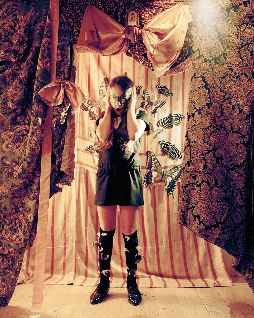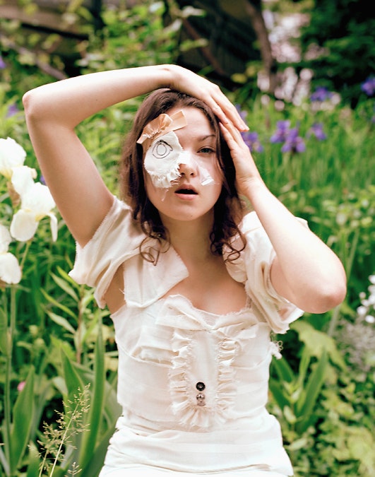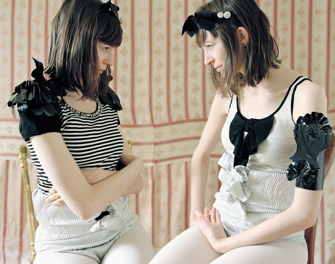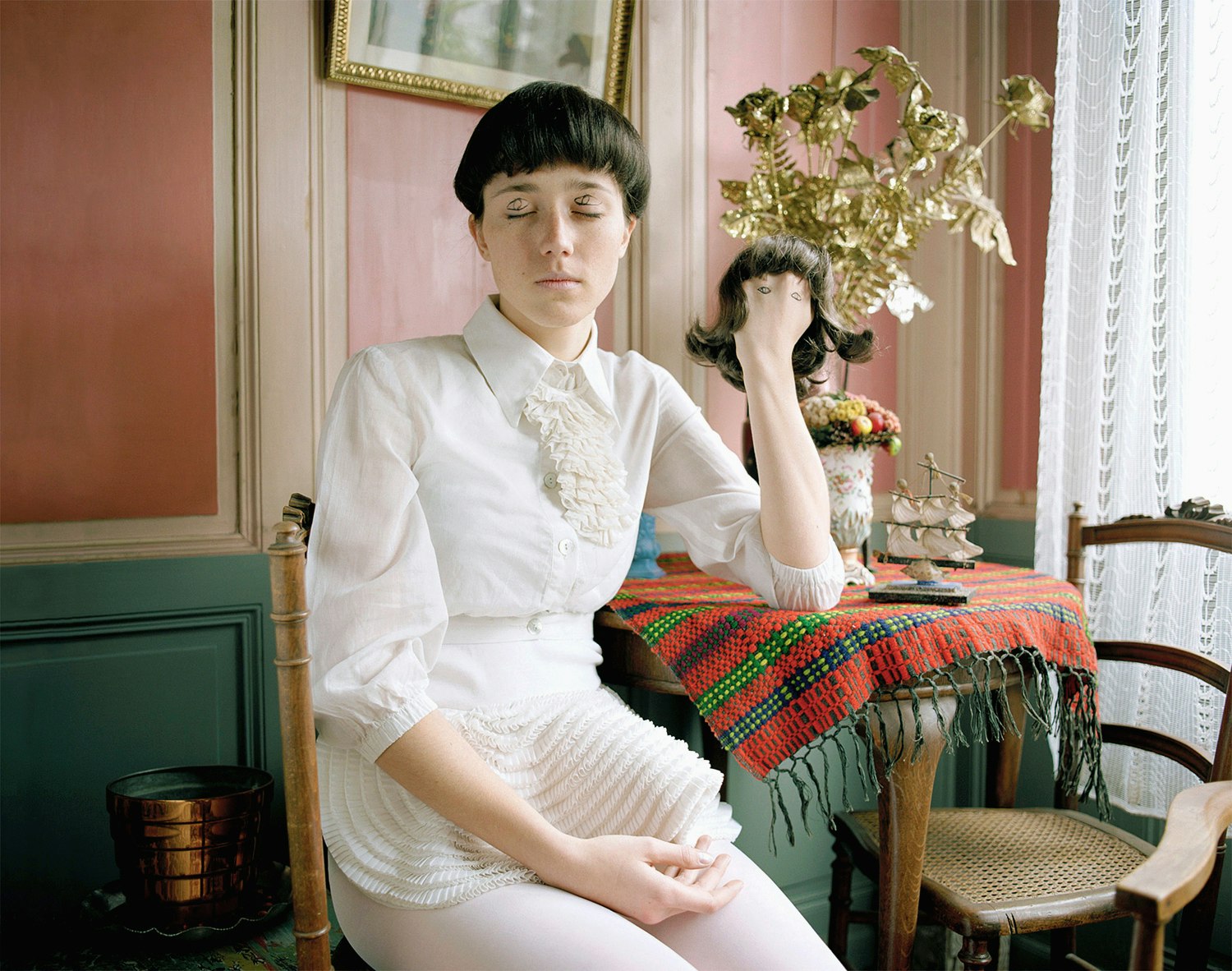 Une jeune femme est assise à une table ronde de bois sombre, elle a les yeux fermés. Elle porte une blouse blanche, un tablier à volants blancs et des collants blancs. Sur le dos de sa main gauche, elle-même coiffée d'une perruque brune de poupée, sont dessinés deux yeux au crayon feutre. La photographie est à la fois fascinante et irritante.