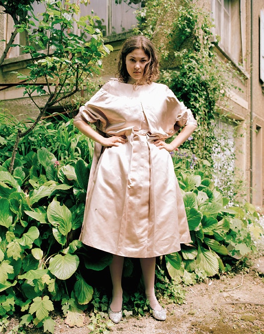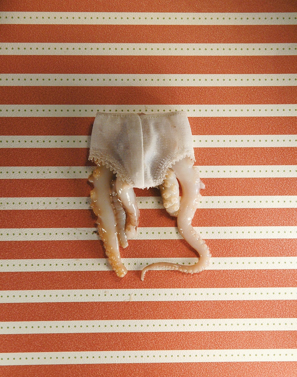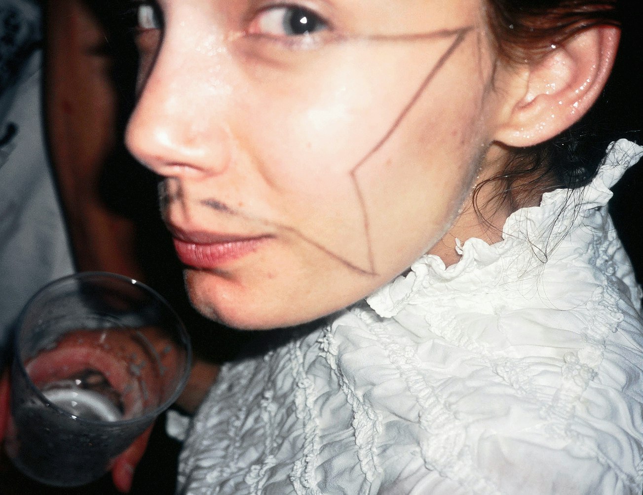 Une jeune femme est assise à une table ronde de bois sombre, elle a les yeux fermés. Elle porte une blouse blanche, un tablier à volants blancs et des collants blancs. Sur le dos de sa main gauche, elle-même coiffée d'une perruque brune de poupée, sont dessinés deux yeux au crayon feutre. La photographie est à la fois fascinante et irritante.