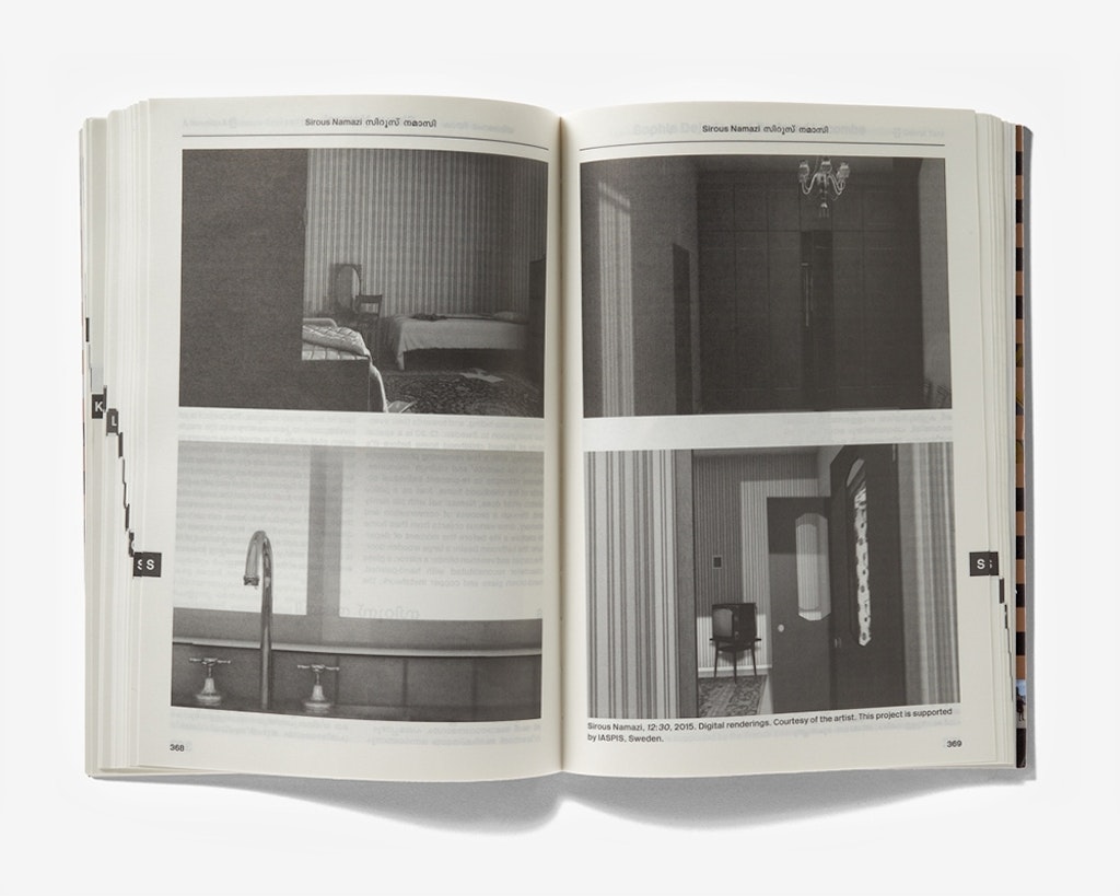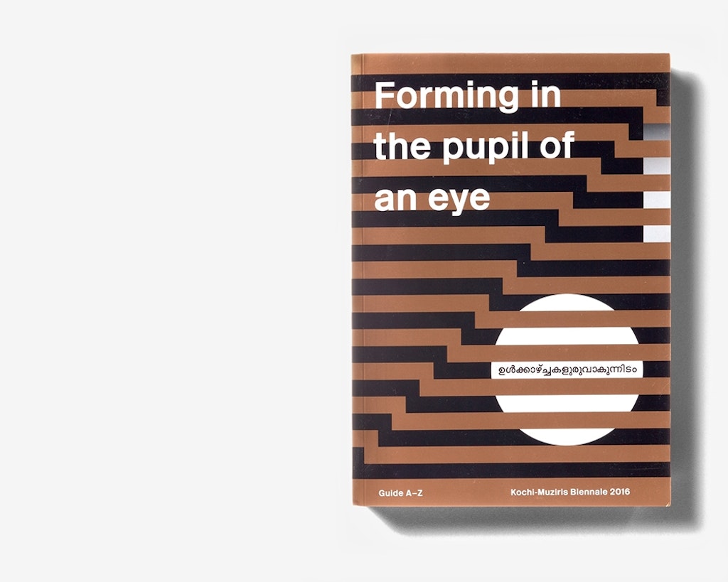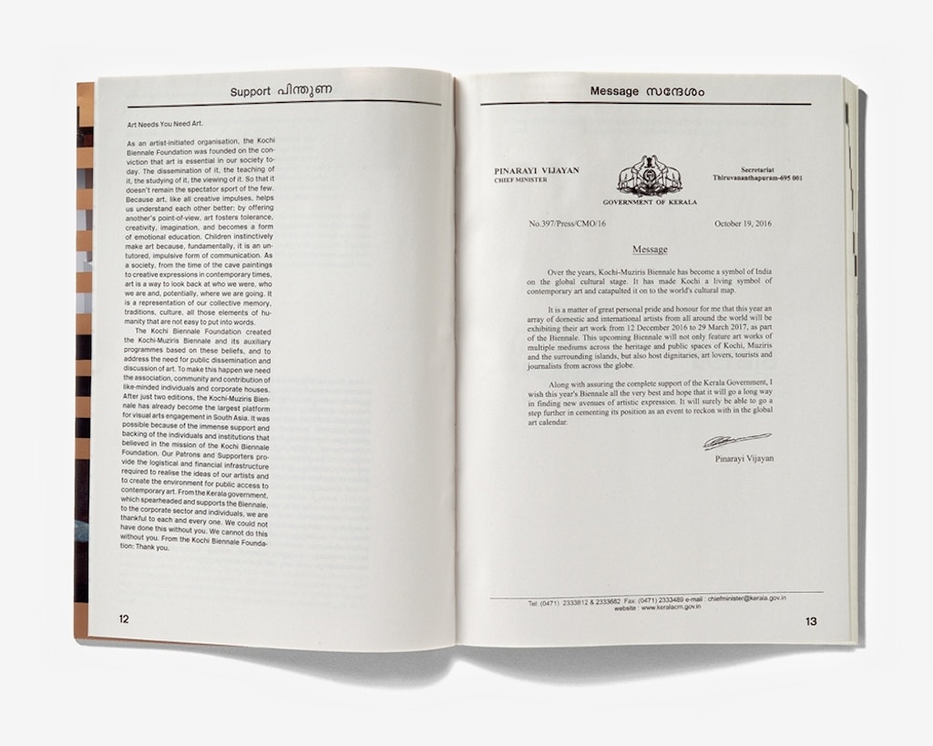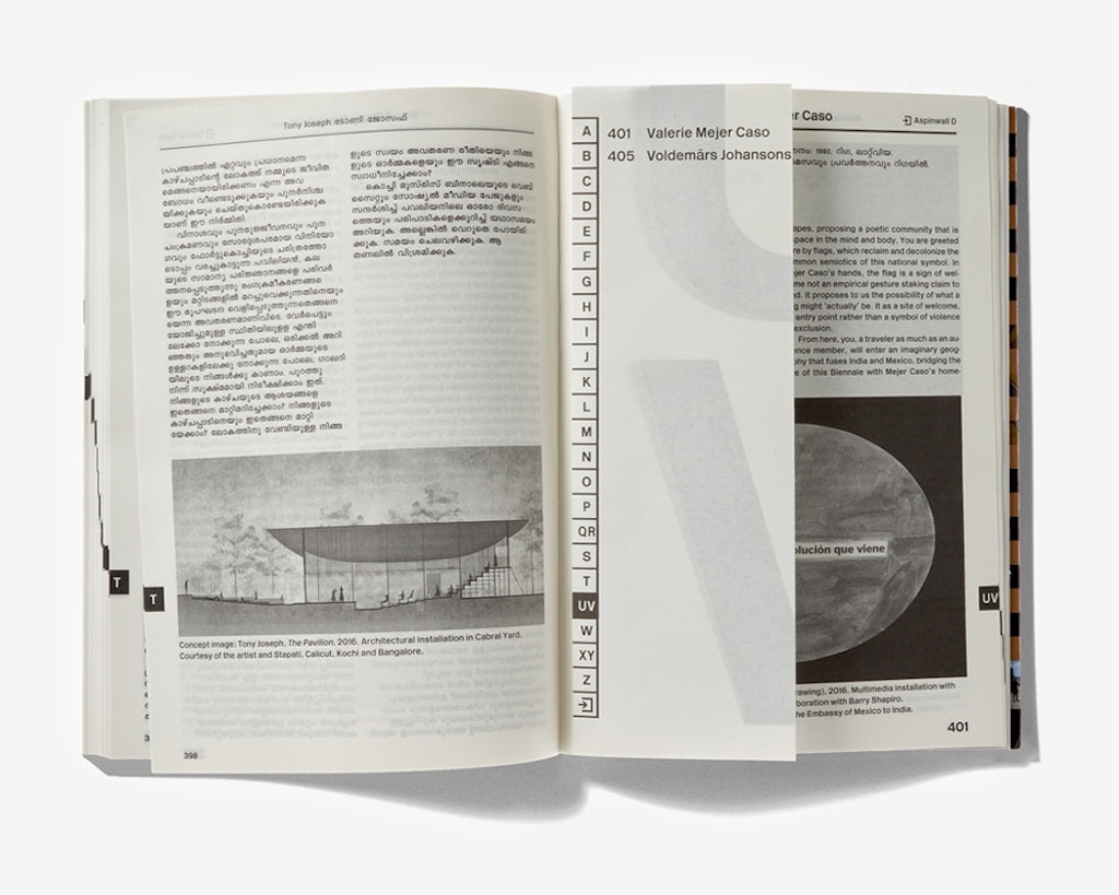 Edité, réalisé et imprimé en Inde, le catalogue de la Biennale Kochi-Murizis de Kerala est le symbole de la réussite d’une collaboration entre une équipe internationale de rédaction et des designers suisses et indiens. Extérieurement, avec sacouverture souple et ses rabats, lelivre se présente dans une teinte bronze. Une fois passées quelques pages doubles ornées des logos quadricolores des nombreux sponsors, vient la partie catalogue entièrement en noir et blanc. Les quelque cent participants sont présentés par ordre alphabétique; comme c’est l’usage en Inde, le prénom est déterminant. Des repères alphabétiques sur la tranche et des demi-pages insérées pour chaque lettre facilitent l’orientation. Les textes brefs et illustrés, en anglais et en malayalam, sont placés sur chaque page de façon à établirune égalité entre les deux langues, une impression que confirment le choix de la police, la typographie et le format de texte. Viennent ensuite une série de pages dépliables qui présentent à l’extérieur les plans simplifiés des lieux d’exposition, etqui, à l’intérieur, mettent envaleur différents aspects de l’espace dans une impression enquatre couleurs plus le bronze.
