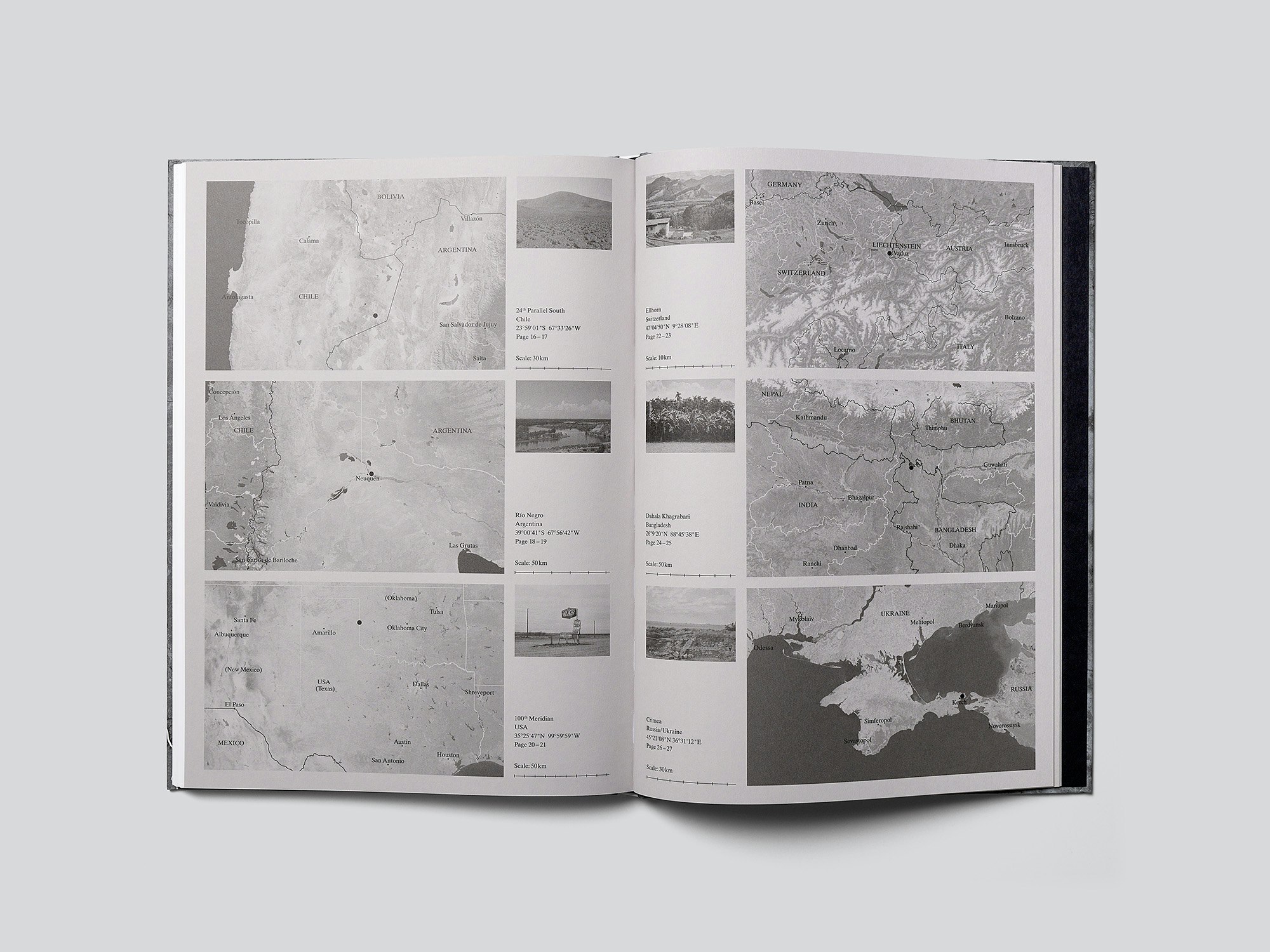 Ce livre de photographie de grand format à la couverture rigide gris argent, qui compte un peu plus de 100 pages, convainc par sa manière aussi systématique qu’extraordinaire d’organiser les rapports entre texte et image. Les photographies couleur, souvent immatérielles, montrent d’anciennes zones frontalières de par le monde que le photographe suisse Roger Eberhard est allé visiter. Les reproductions sont placées soit sur la droite soit sur la gauche d’une double page et occupent toute la largeur du miroir de page. Sur les pages en regard, des indications sommaires sur le pays et le lieu, une date, le folio ainsi que des explications succinctes du photographe sont rigoureusement agencées de manière à refléter le miroir de page et le format de l’image. Cet agencement fournit non seulement un excellent système de navigation mais donne également aux pages textuelles l’aspect de légendes cartographiques. L’espace créé par la page du livre entre ainsi en dialogue avec l’espace du paysage photographié, l’un comme l’autre paraissent également vides et laissent une large place à l’imagination. Dans l’index des illustrations qui s’étend sur 15 pages de papier gris non couché en fin d’ouvrage, chaque image est reproduite en noir et blanc et accompagnée d’un agrandissement de carte géographique situant le lieu de la photo.