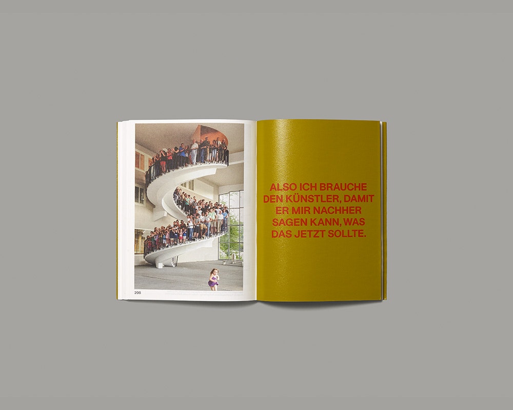 Ce petit livre de poche à couverture souple, très bien pensé, sur un projet d'école d'art inhabituel, explore des espaces de collaboration aux limites de l'art et de la recherche. À la Badener Berufsfachschule (BBB), qui propose notamment des formations dans la mécanique, la gastronomie et les techniques de l’information, une chaire de création artistique a été instituée en 2011 pour une durée de huit ans, avec un budget destiné à l’art dans la construction. La publication propose une rétrospective des années 2011–2015, que Nadja Baldini a conçue avec différents artistes. La longue première partie combine des images, sur une ou deux pages, de moments-clés de l’histoire de l’art et de la culture pop, avec deux niveaux de citations d’étudiants sur le rôle de leur profession et sur celui de l’art. Sans plus d’informations, il en ressort une narration riche en associations mais mystérieuse aussi. Dans la deuxième partie, séparée de la première par l’insertion d’un rabat, suivent toutes les informations sur le projet, de même que sur le contenu et les sources des images. Bien que les designers marquent fortement de leur empreinte le niveau éditorial, les mise en pages et la typographie sont réalisées avec tant de méticulosité qu’elles auraient encore fonctionné si les pages avaient été deux fois plus grandes. La matérialité, agréable, contribue à rapprocher le lecteur de l’objet livre.